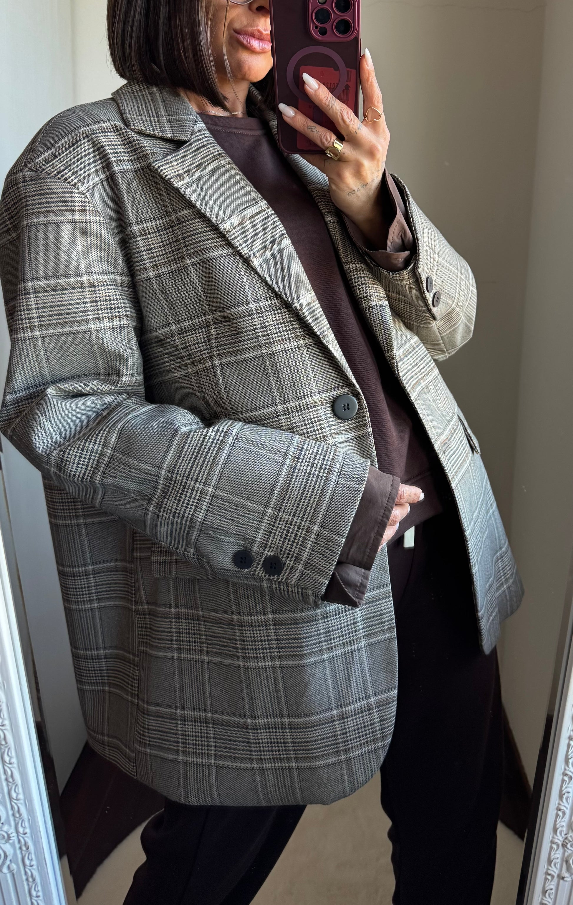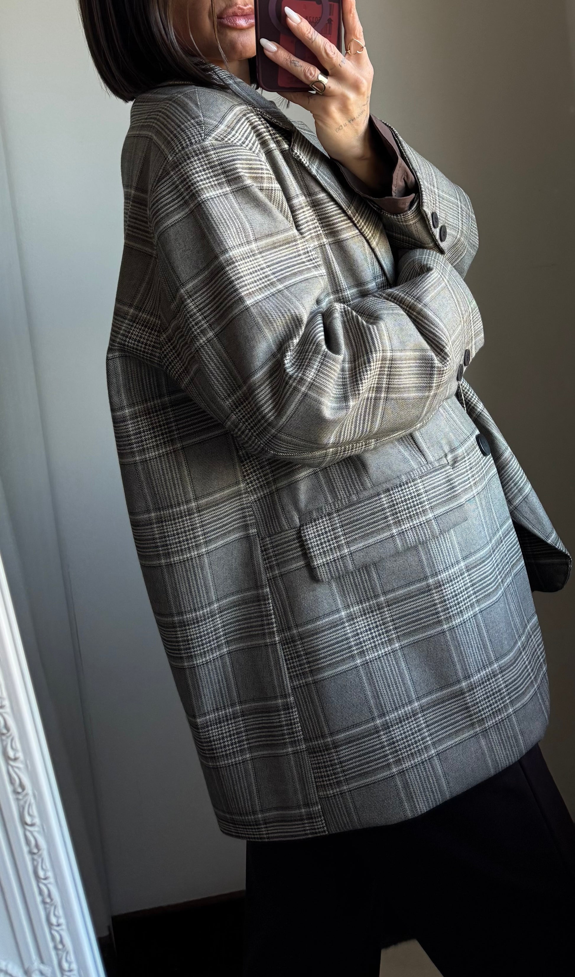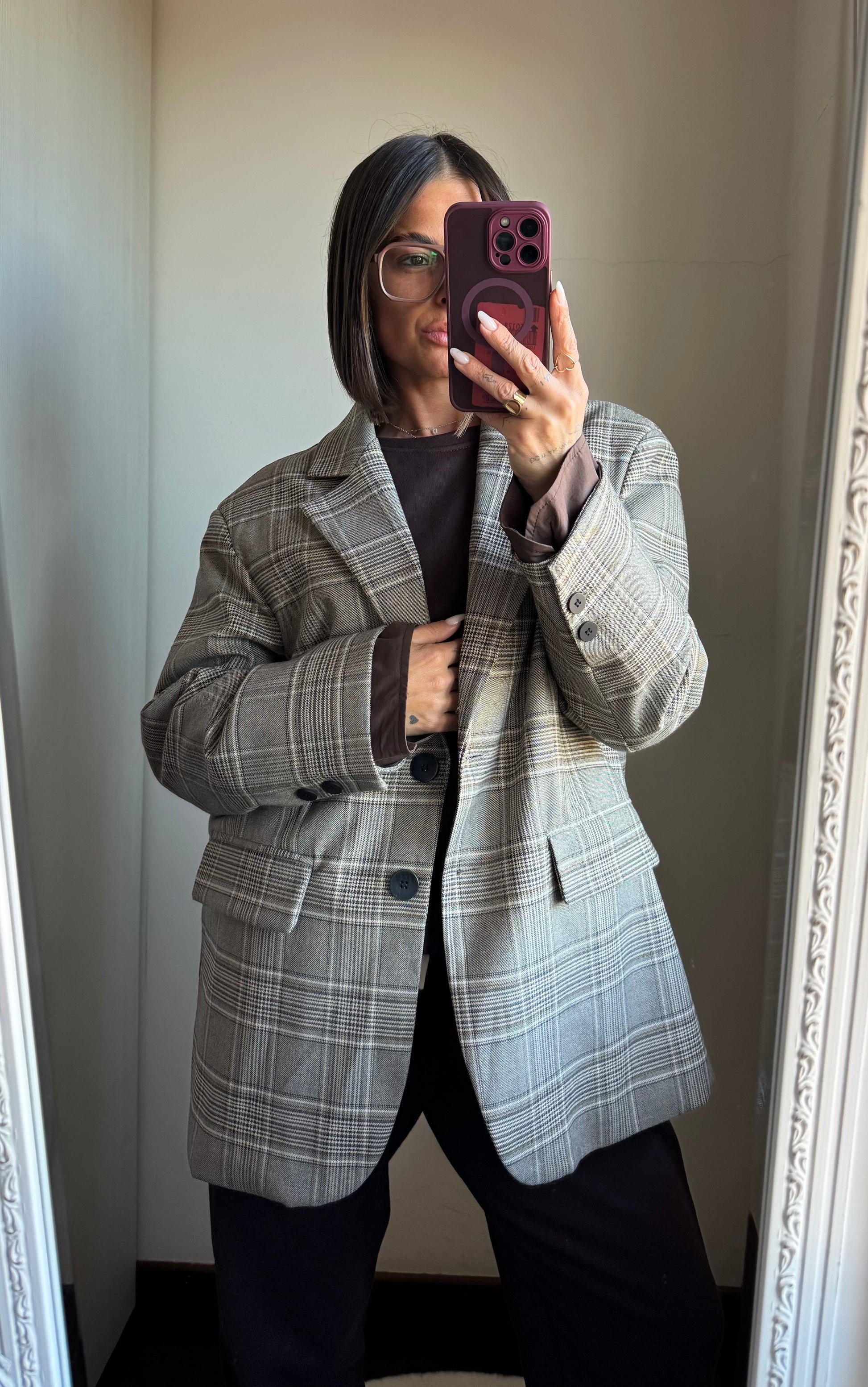 Blazer dal taglio over con spalline leggermente imbottite, foderato all’interno, chiusura con due bottoni e inserti sulle maniche