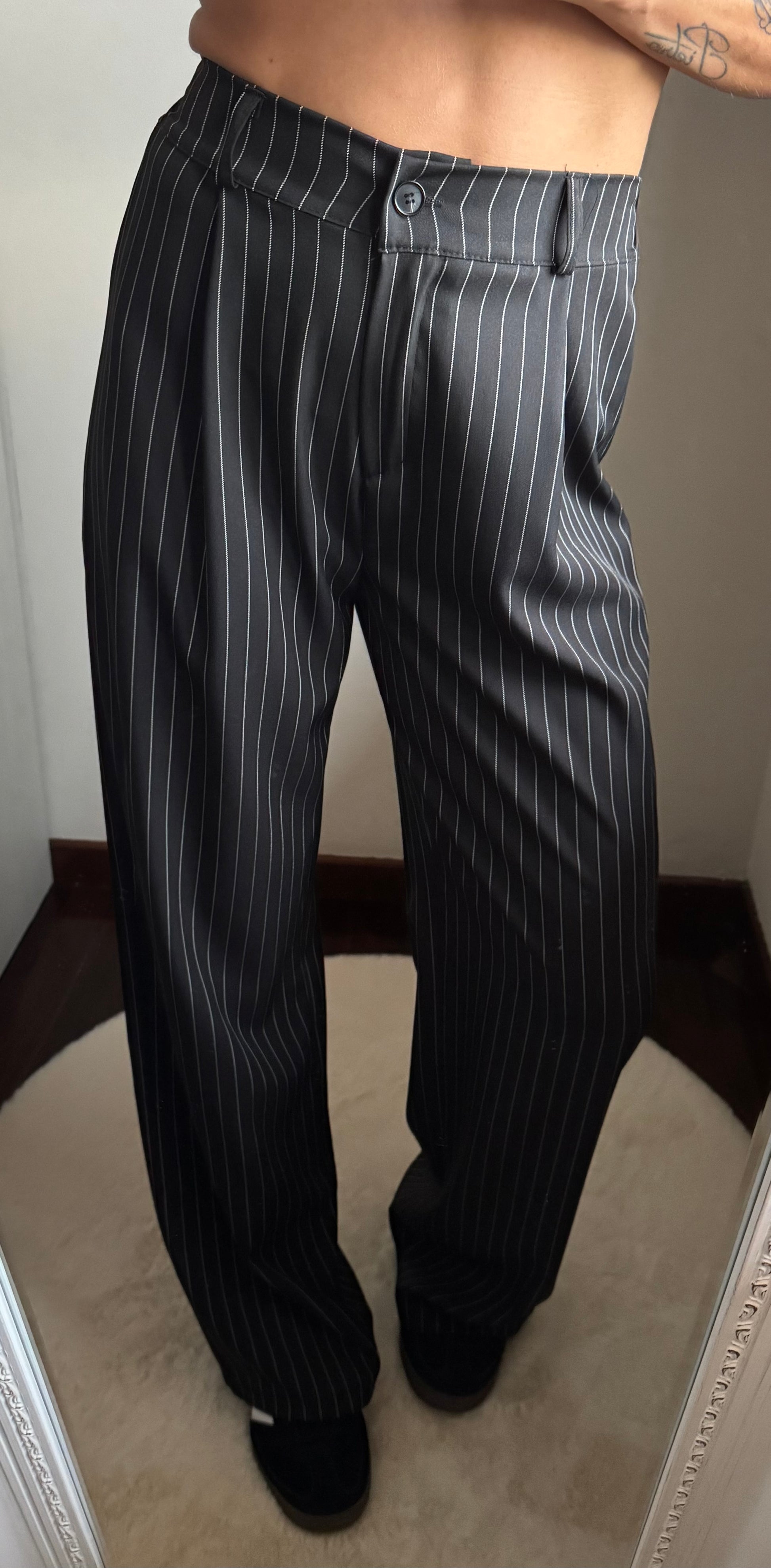 Completo composto da giacca con chiusura doppio petto, spalline leggermente imbottite, foderata all’interno e pantalone a palazzo con elastico dietro la vita