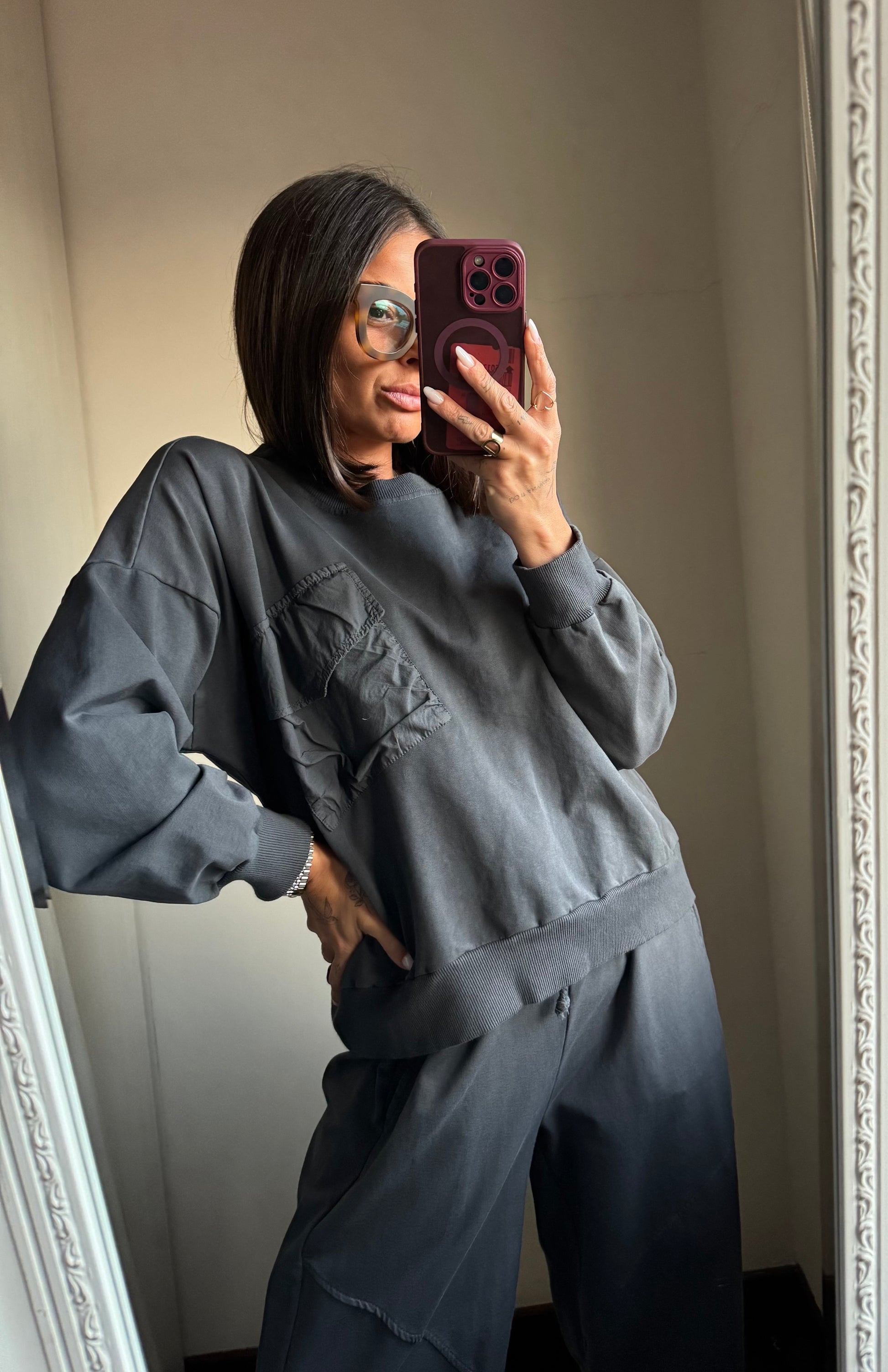 Coordinato in cotone garzato composto da felpa con tasca e pantalone con vita elastica, coulisse e tasche