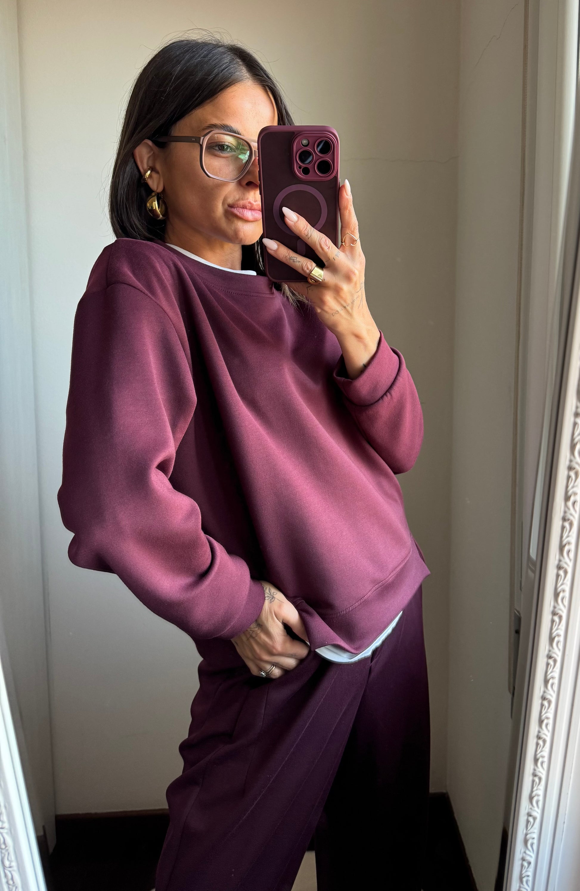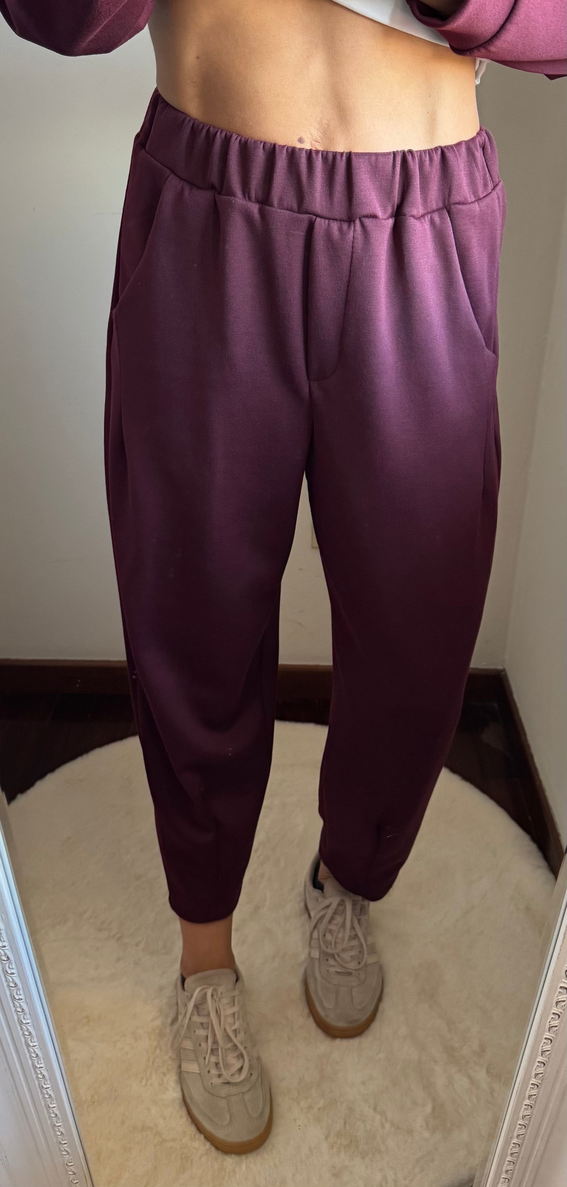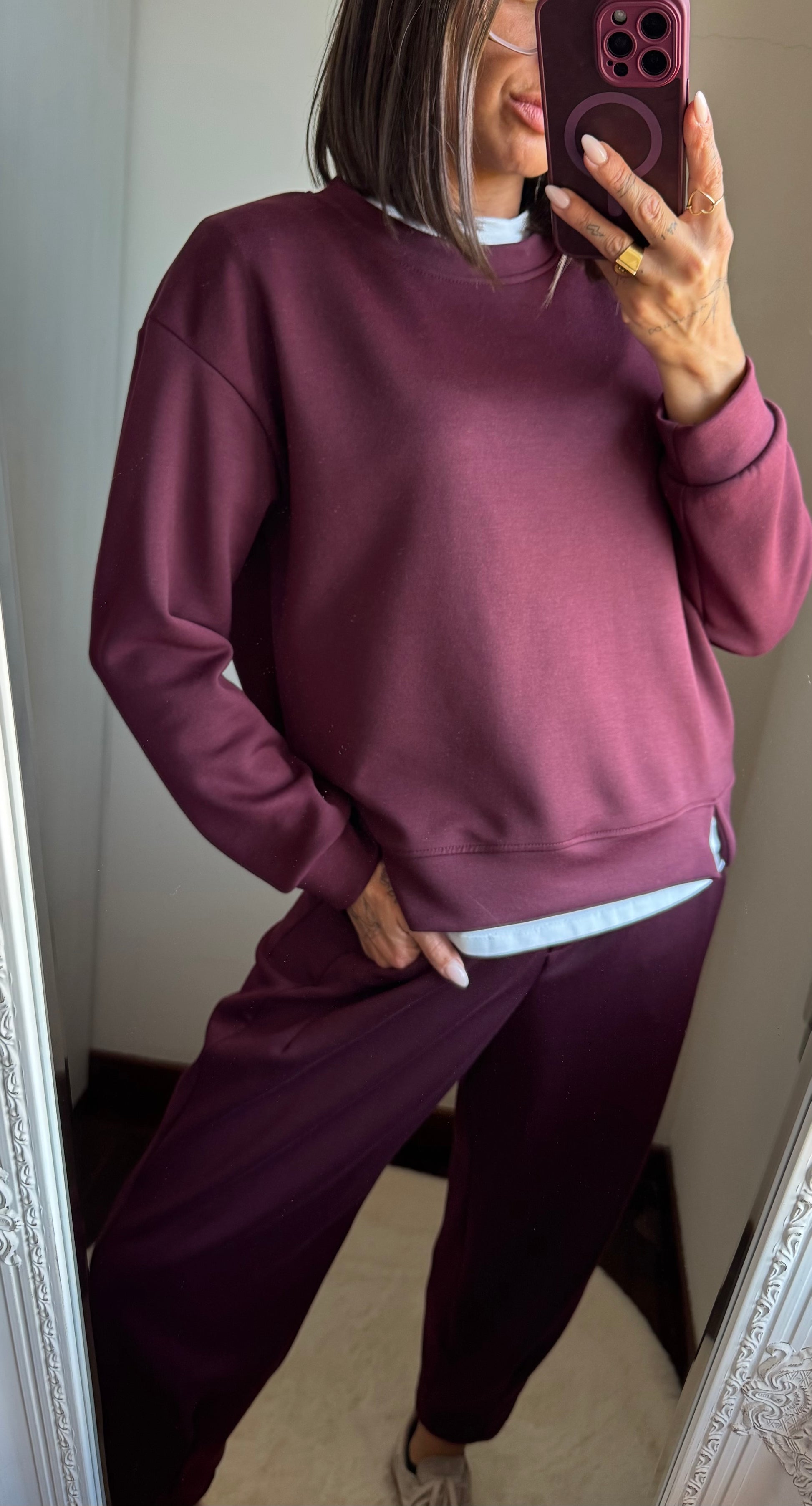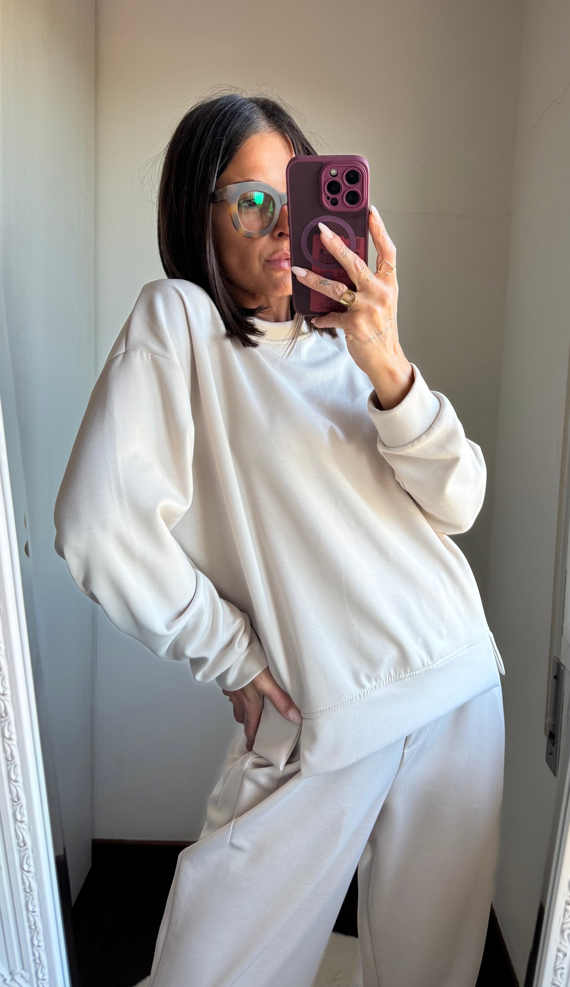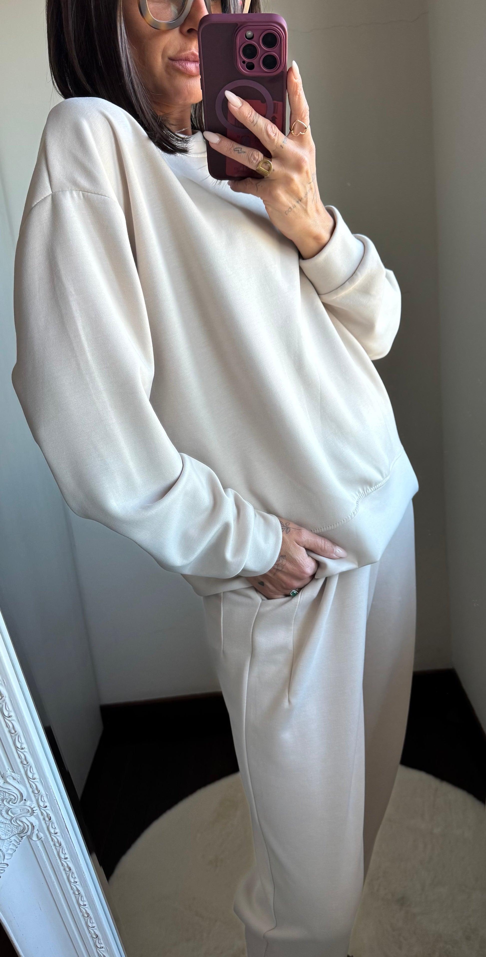 Coordinato tuta in tessuto soft touch composto da felpa con spacchi frontali e pantalone con vita elastica, tasche laterali e tasca sul retro che rimane morbido sulla gamba e si stringe sul fondo