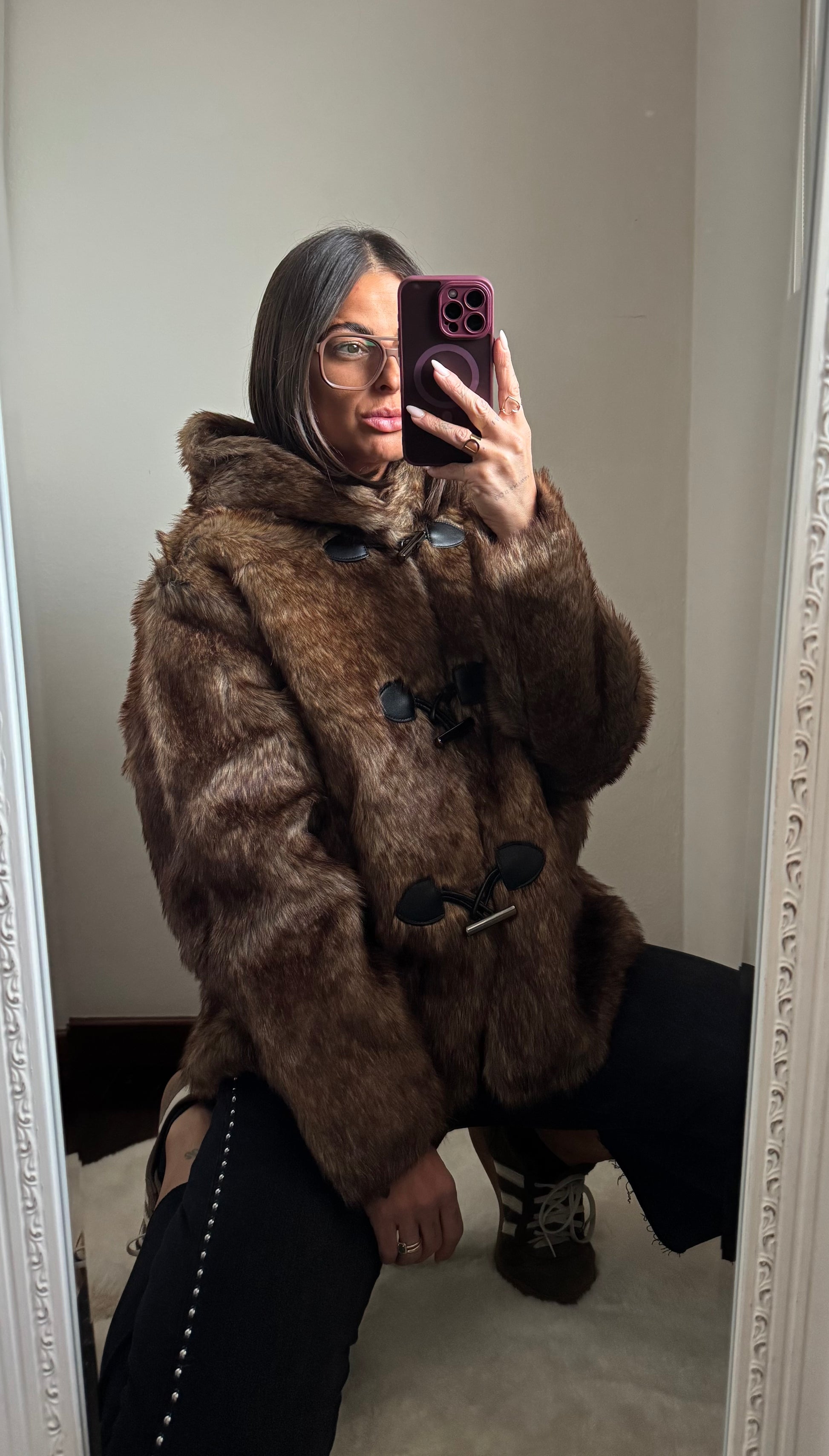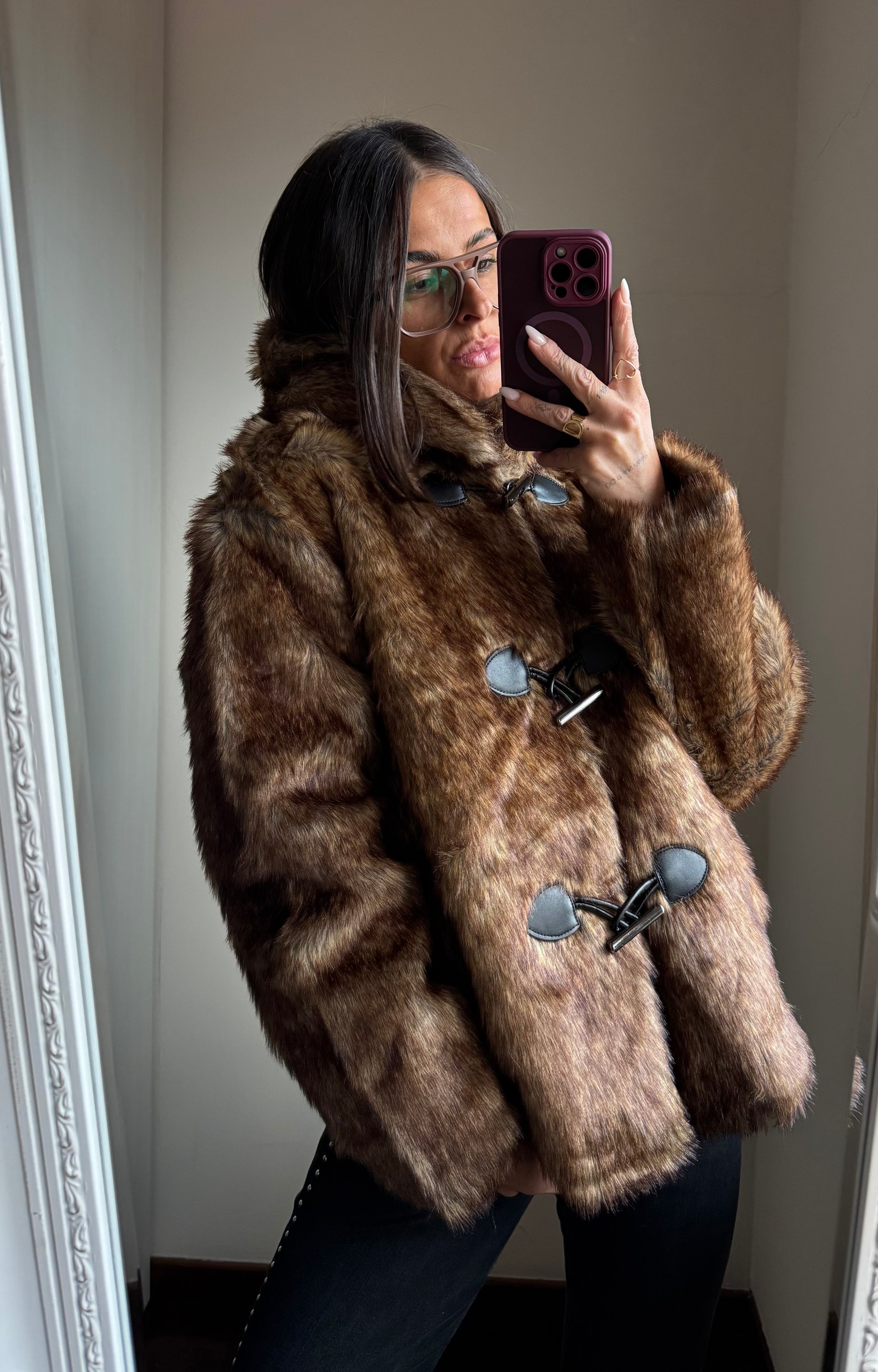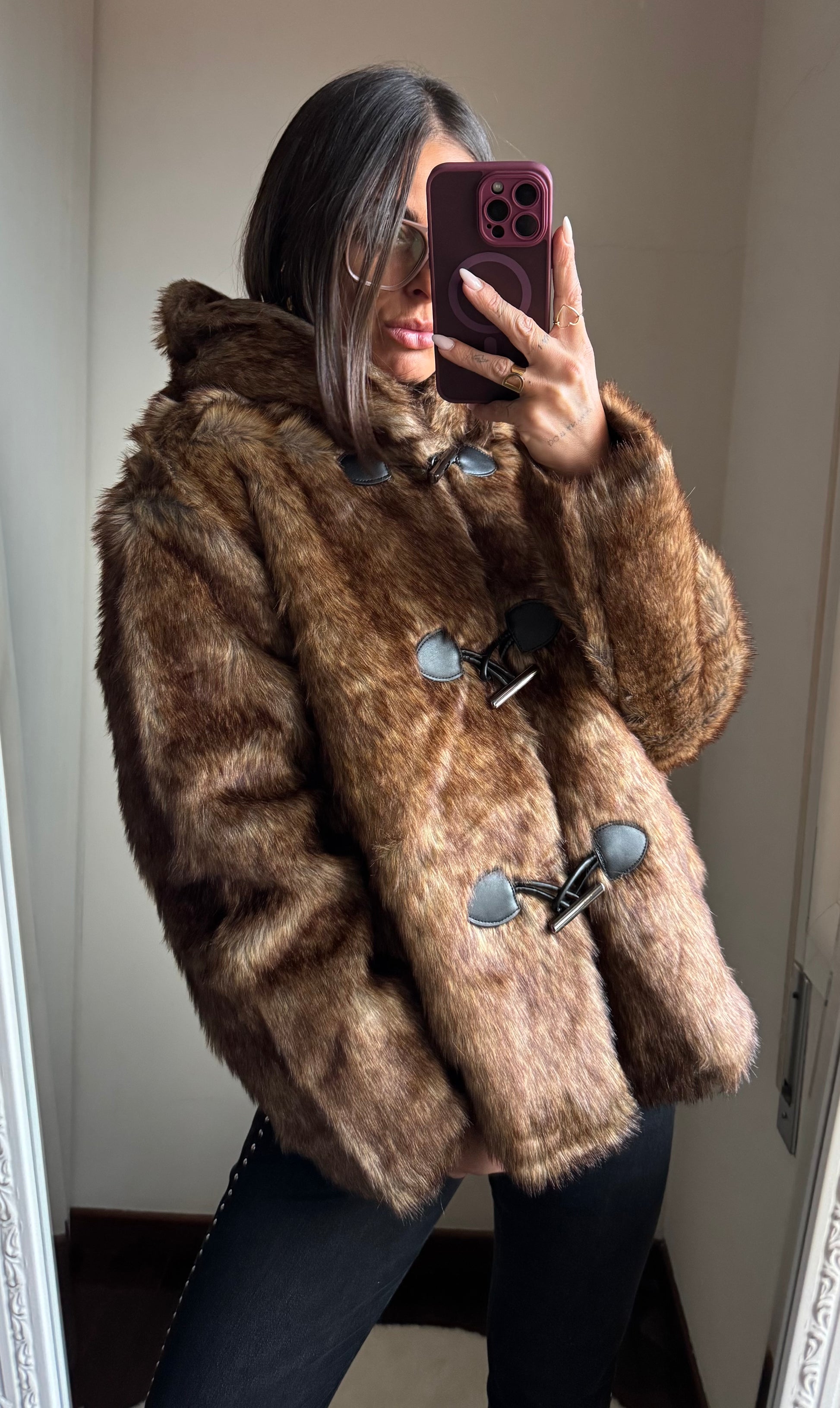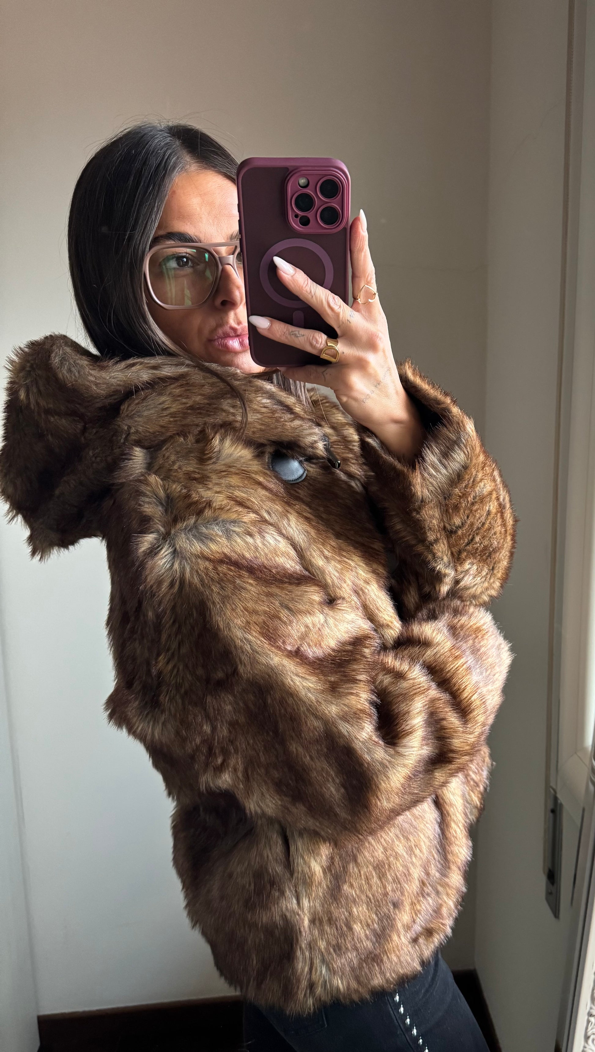 Giacca in ecopelliccia, foderata all’interno, chiusura con tre bottoni e cappuccio