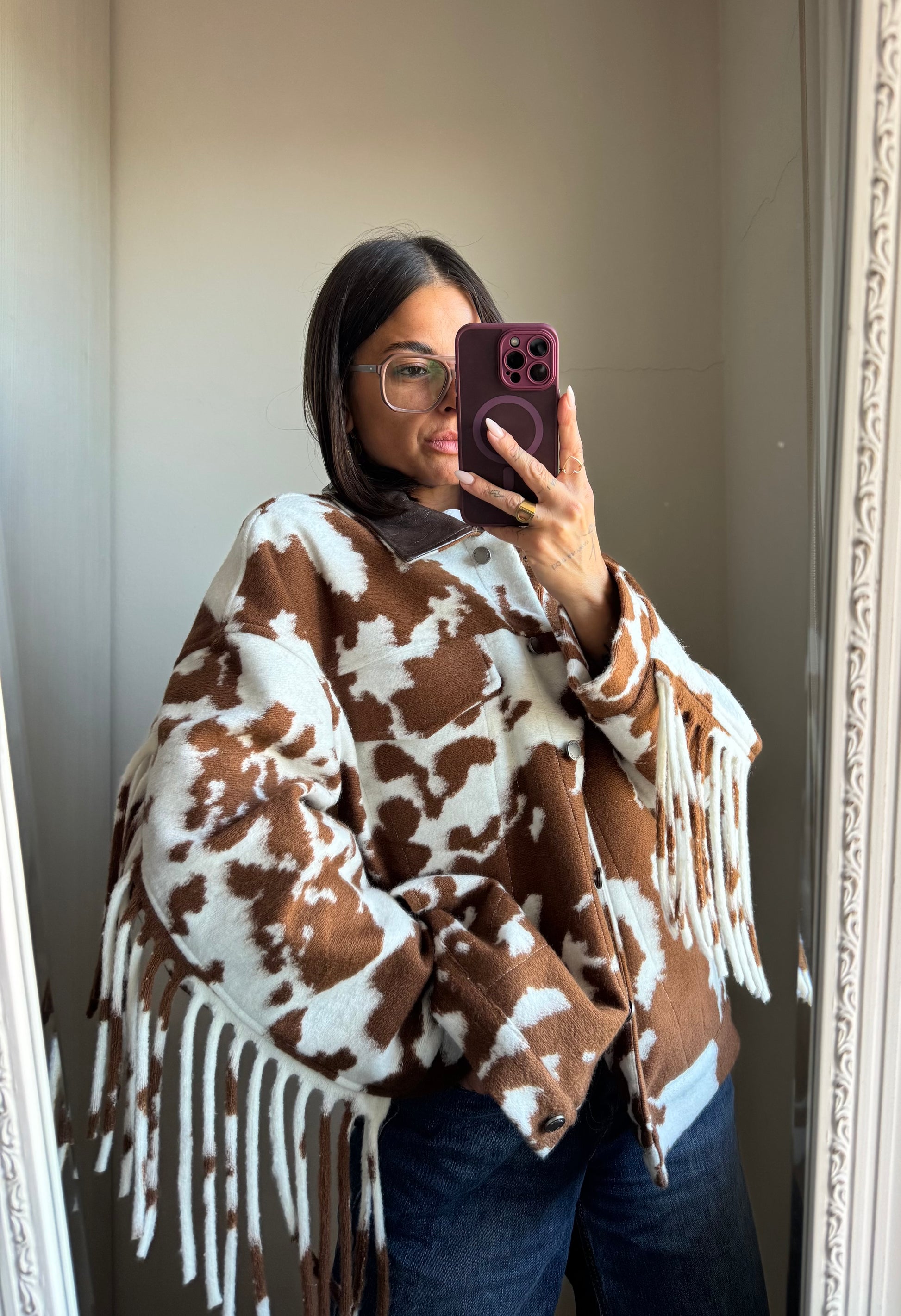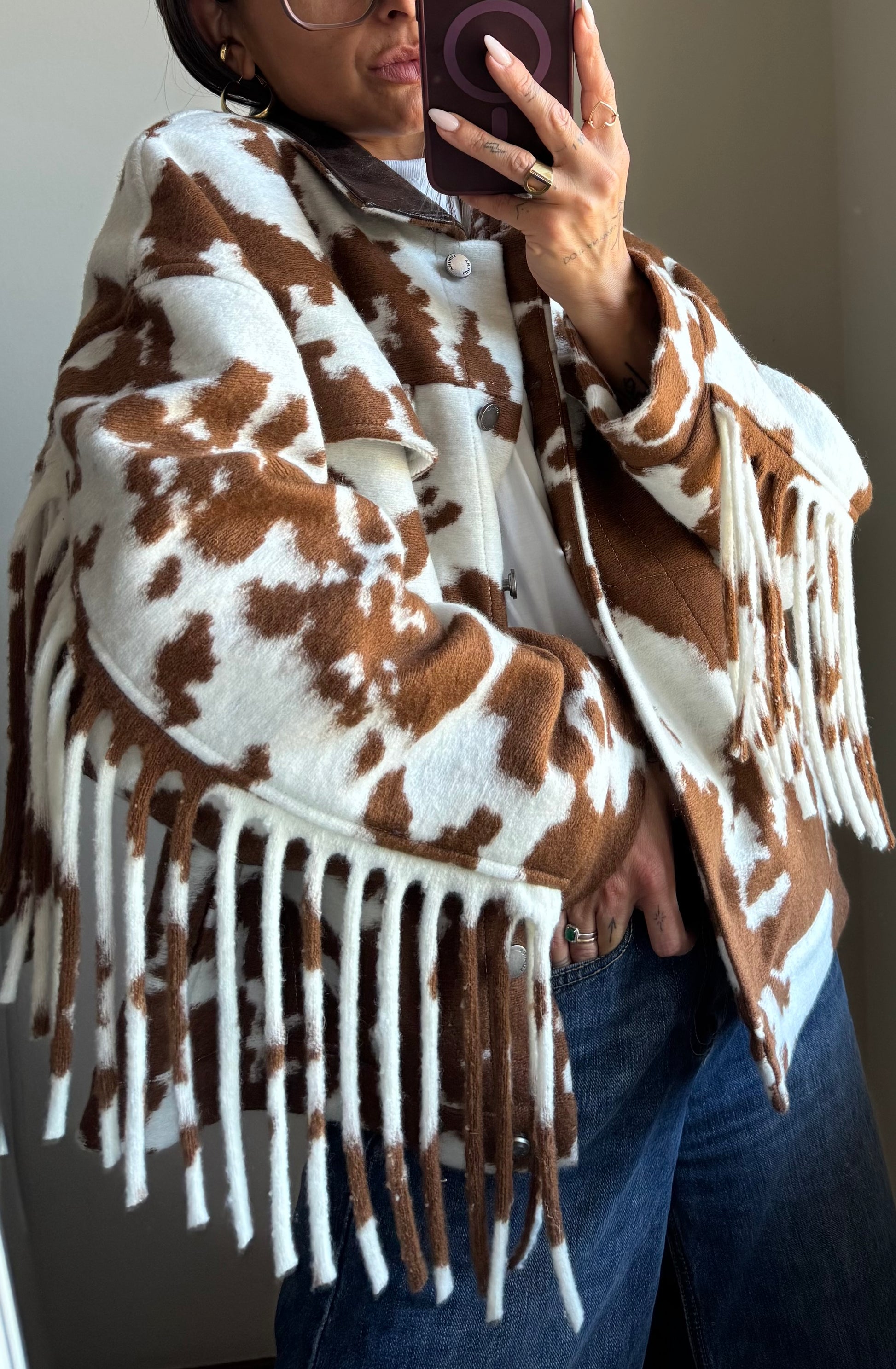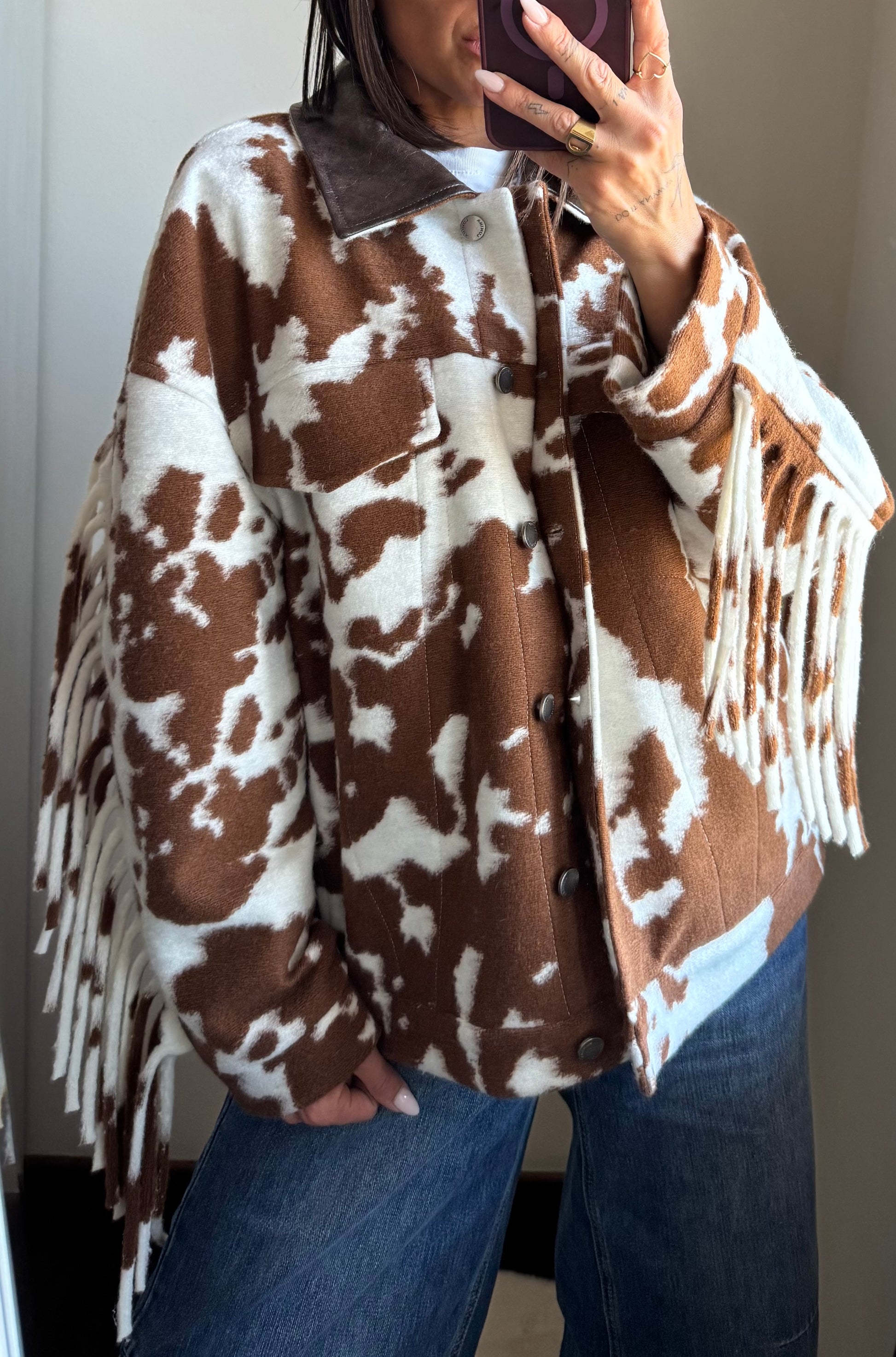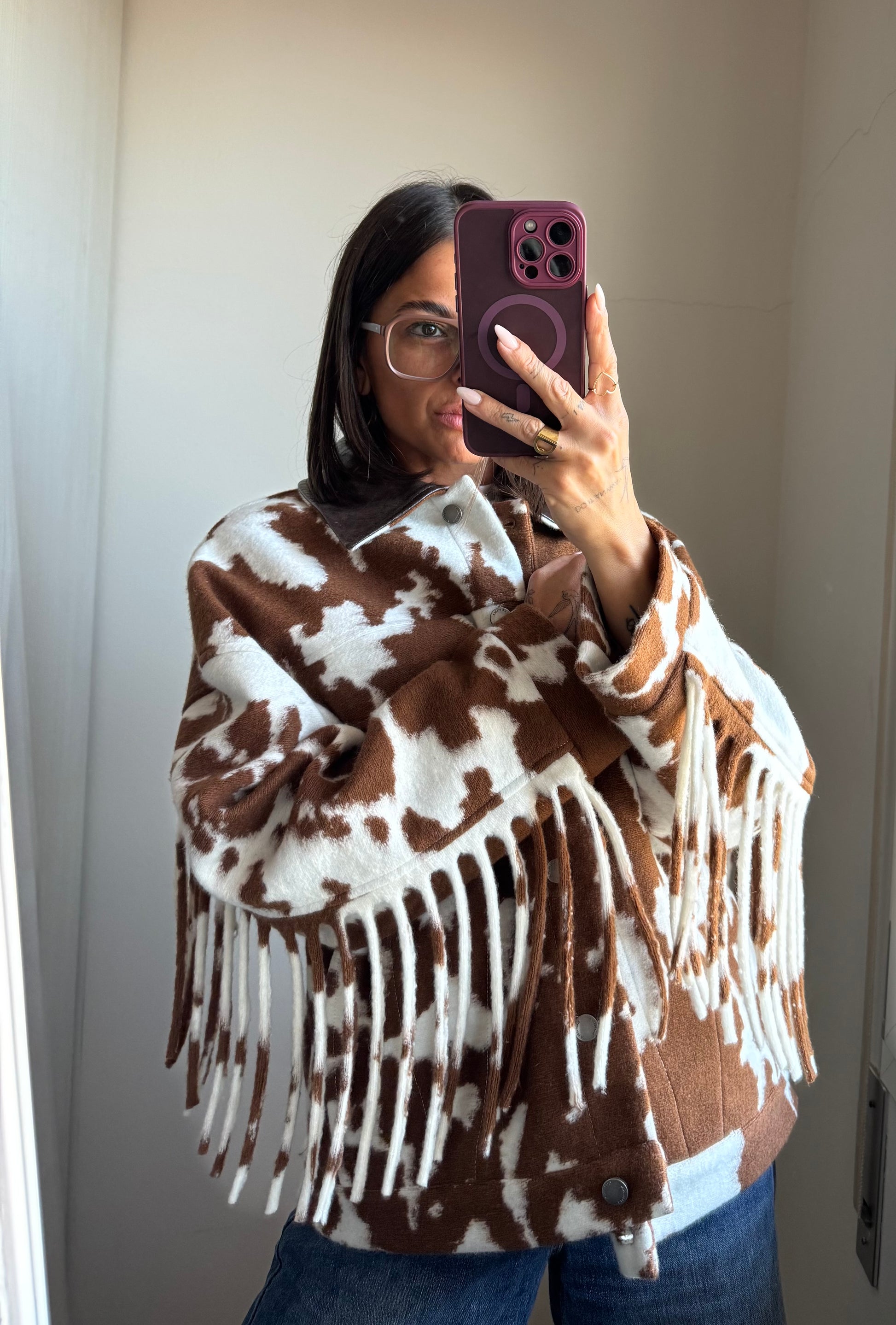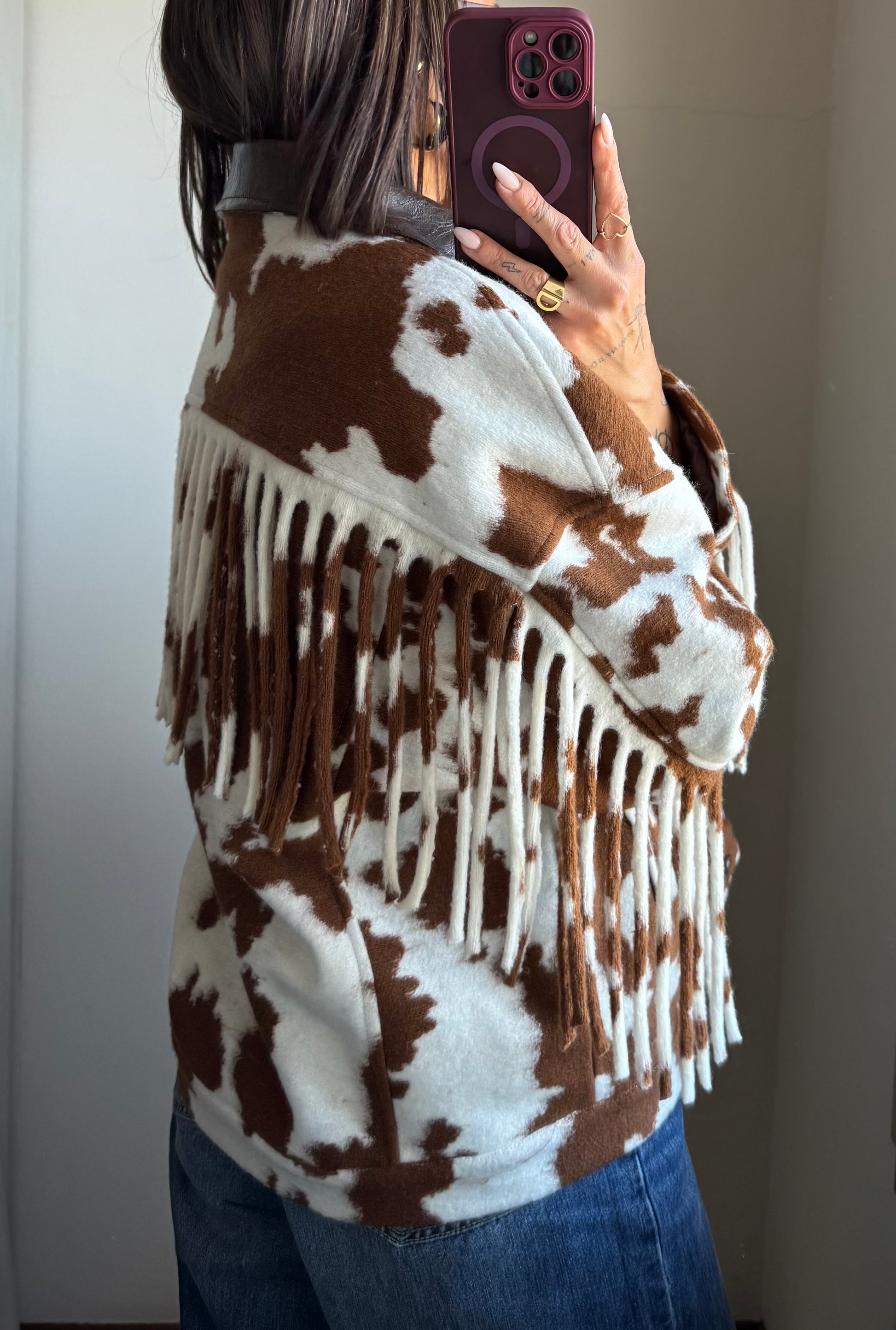 Giacca in panno con frange sulle maniche e sul retro, foderata all’interno, chiusura con bottoni, tasche frontali e colletto a contrasto in ecopelle