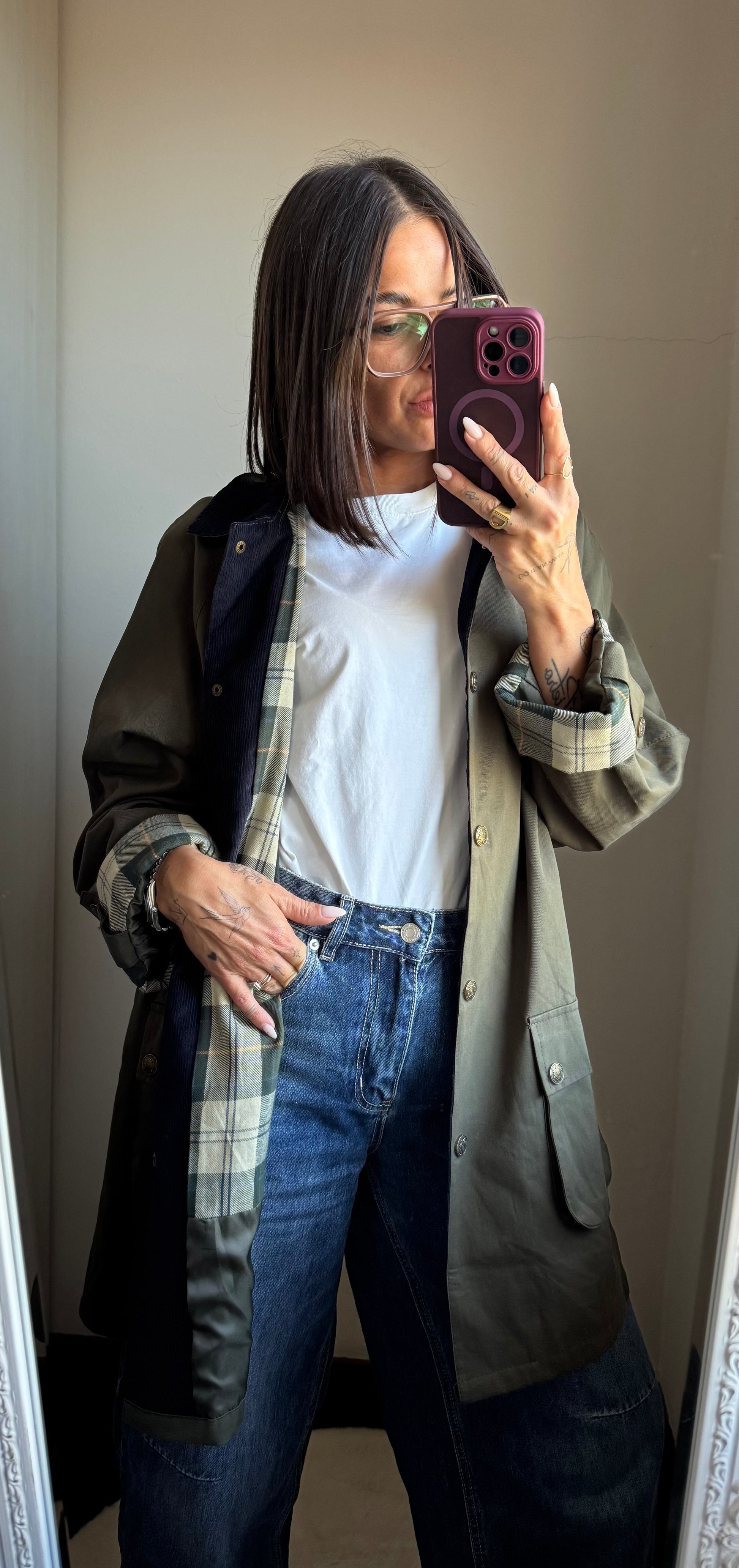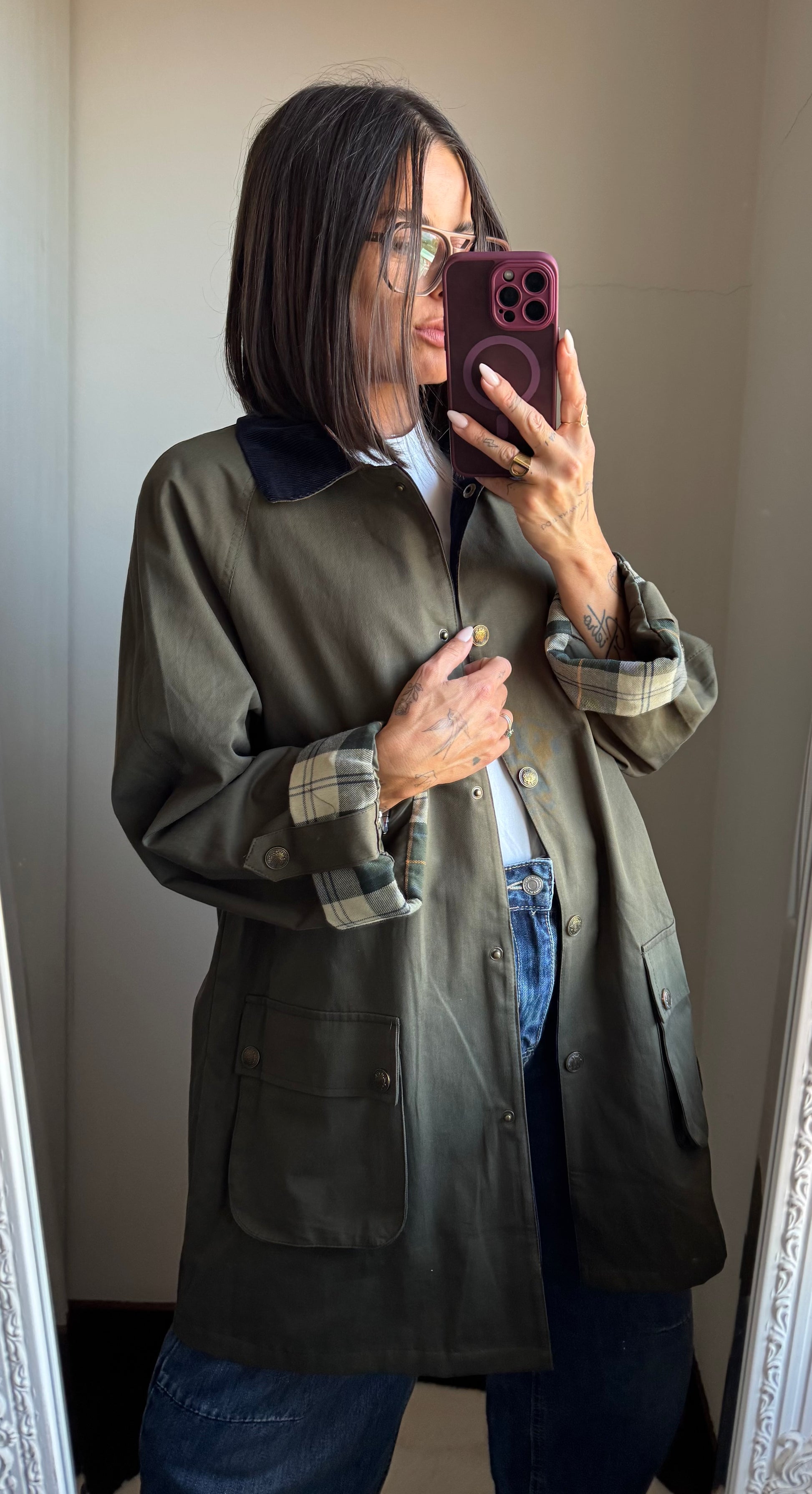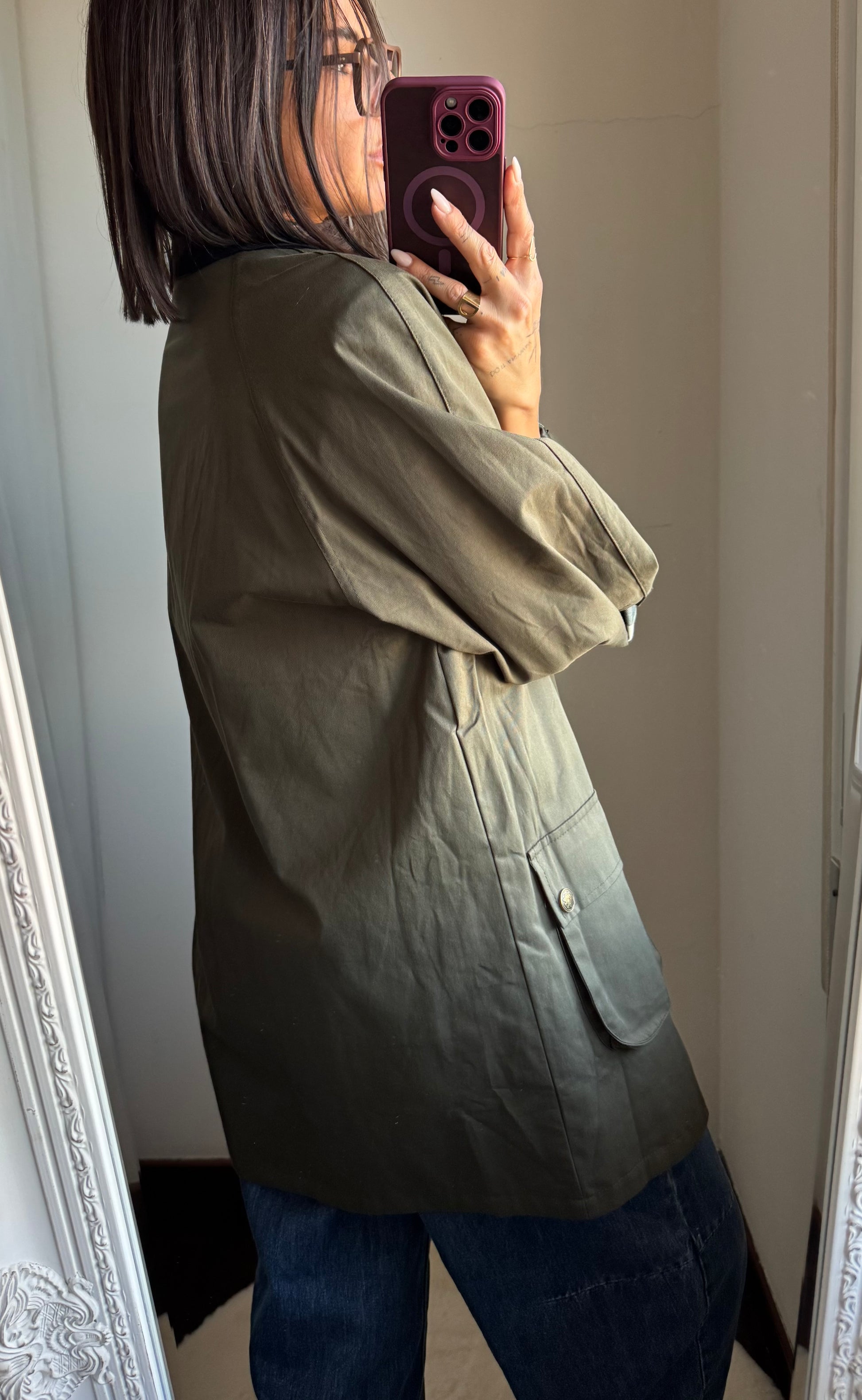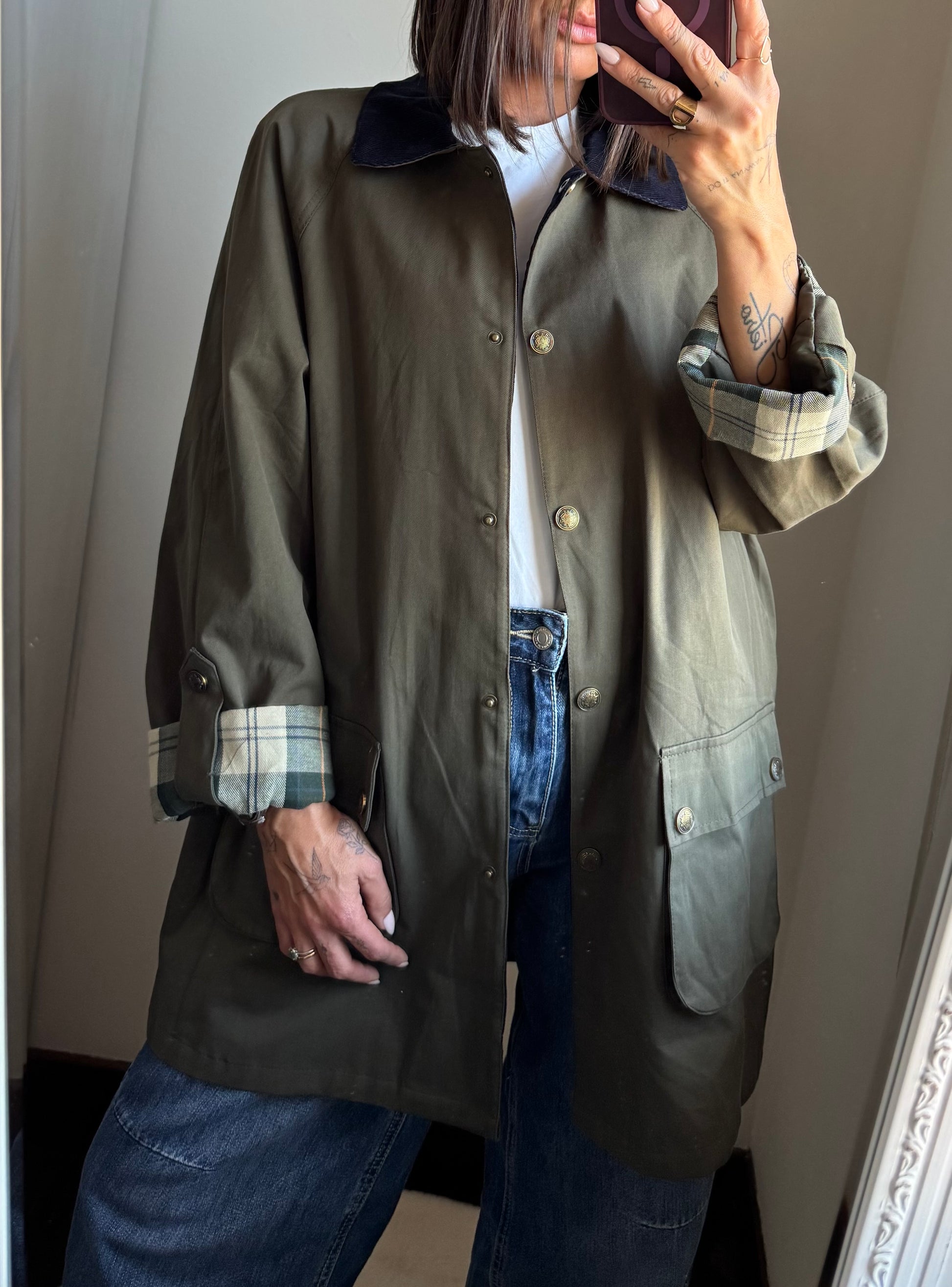 Giacca foderata all’interno, chiusura con bottoni a pressione, tasche frontali e colletto in velluto