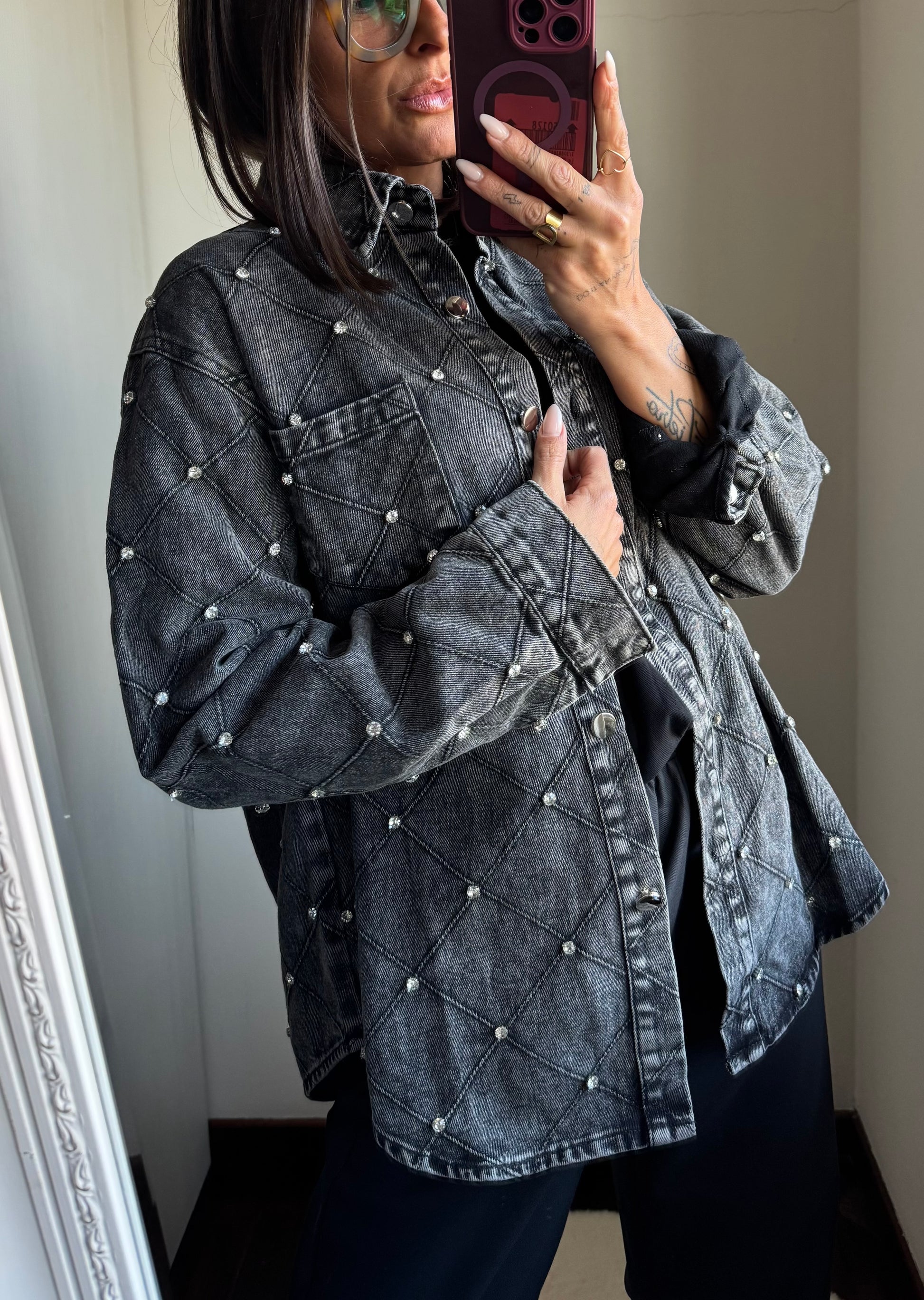 Giacca in denim effetto trapuntato con l’applicazione di strass