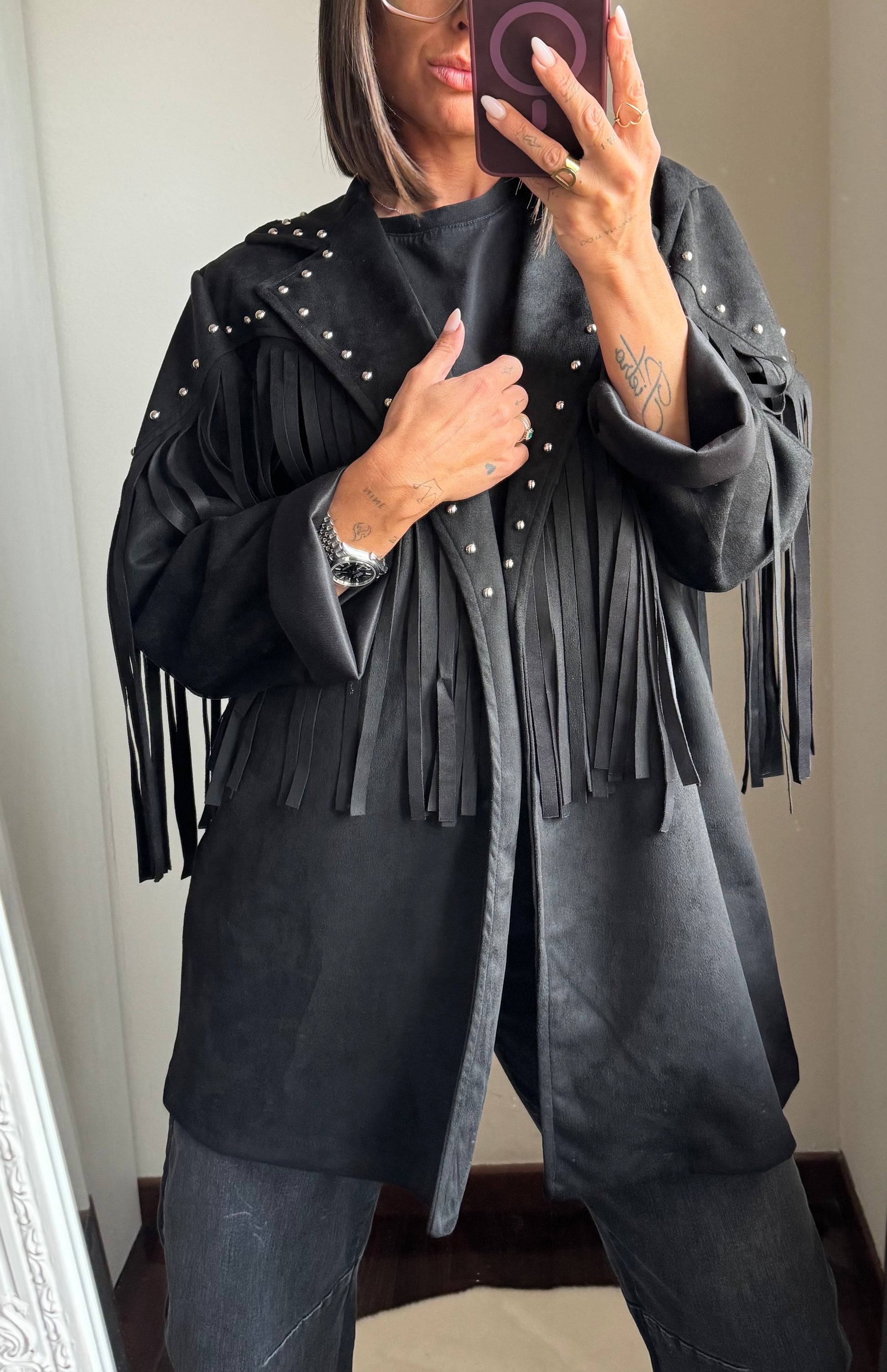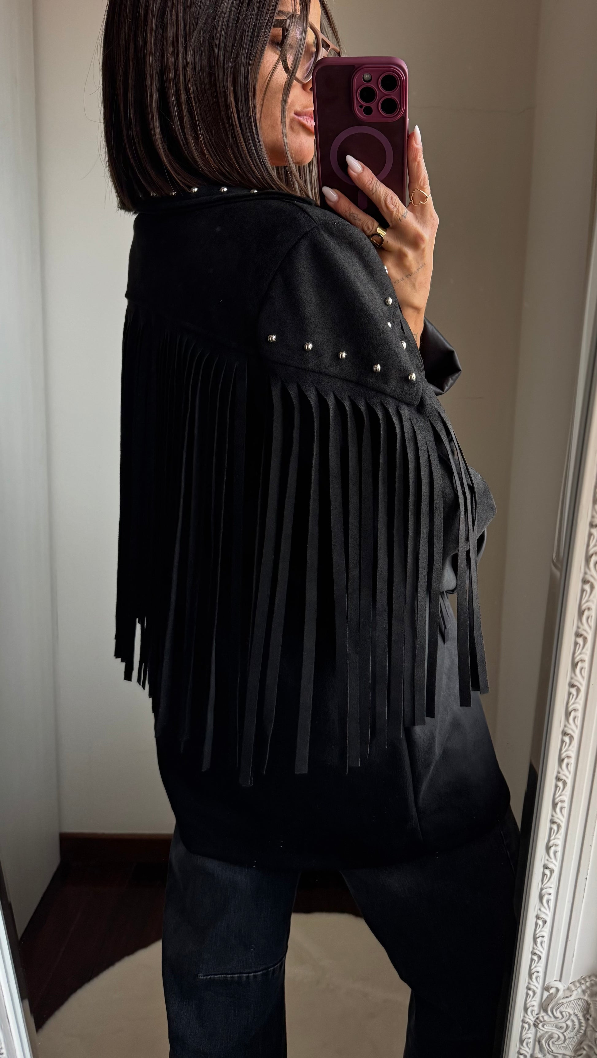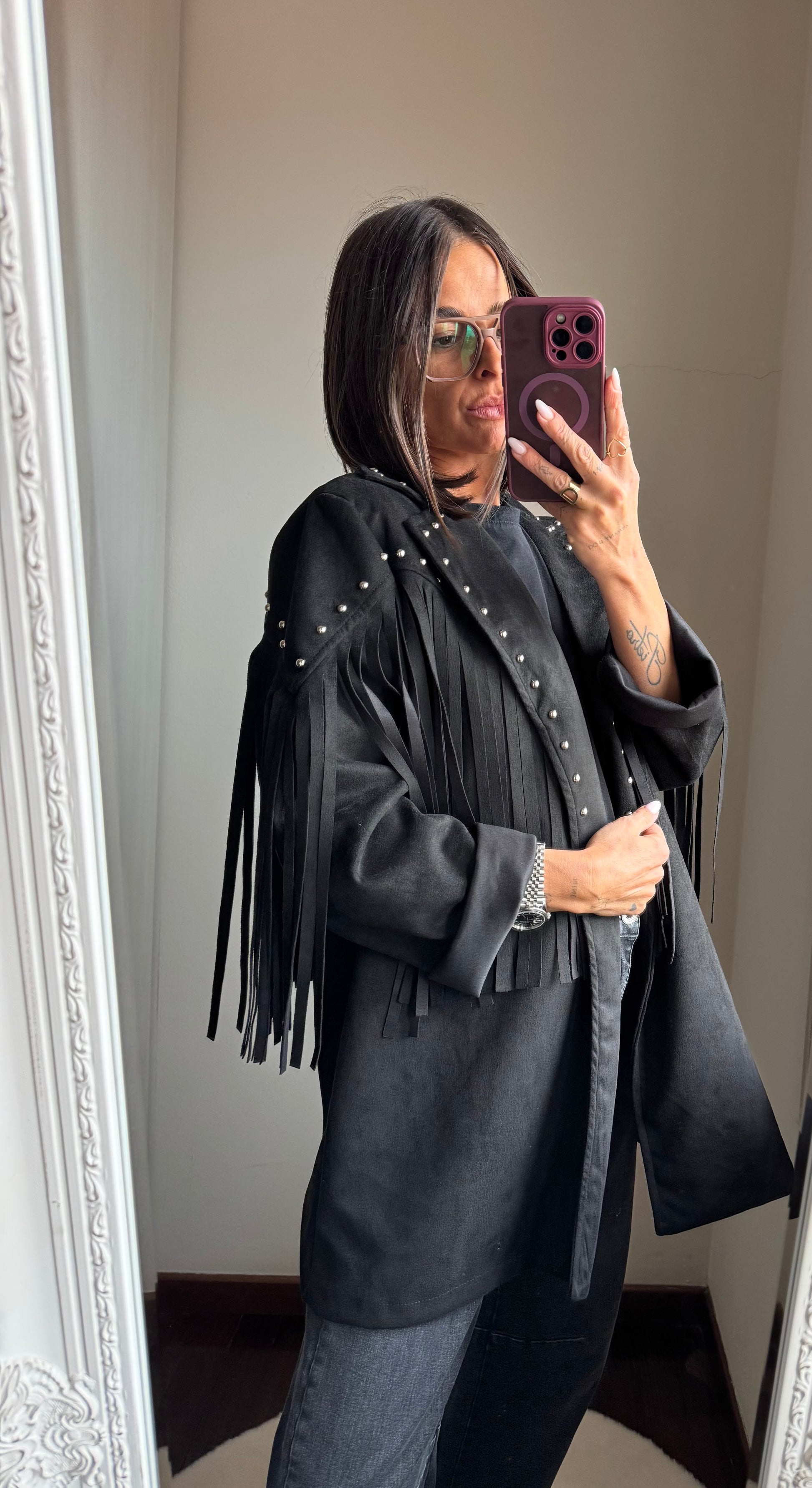 Giacca in tessuto scamosciato con l’applicazione di borchie, presenta frange sia davanti che dietro, non foderata