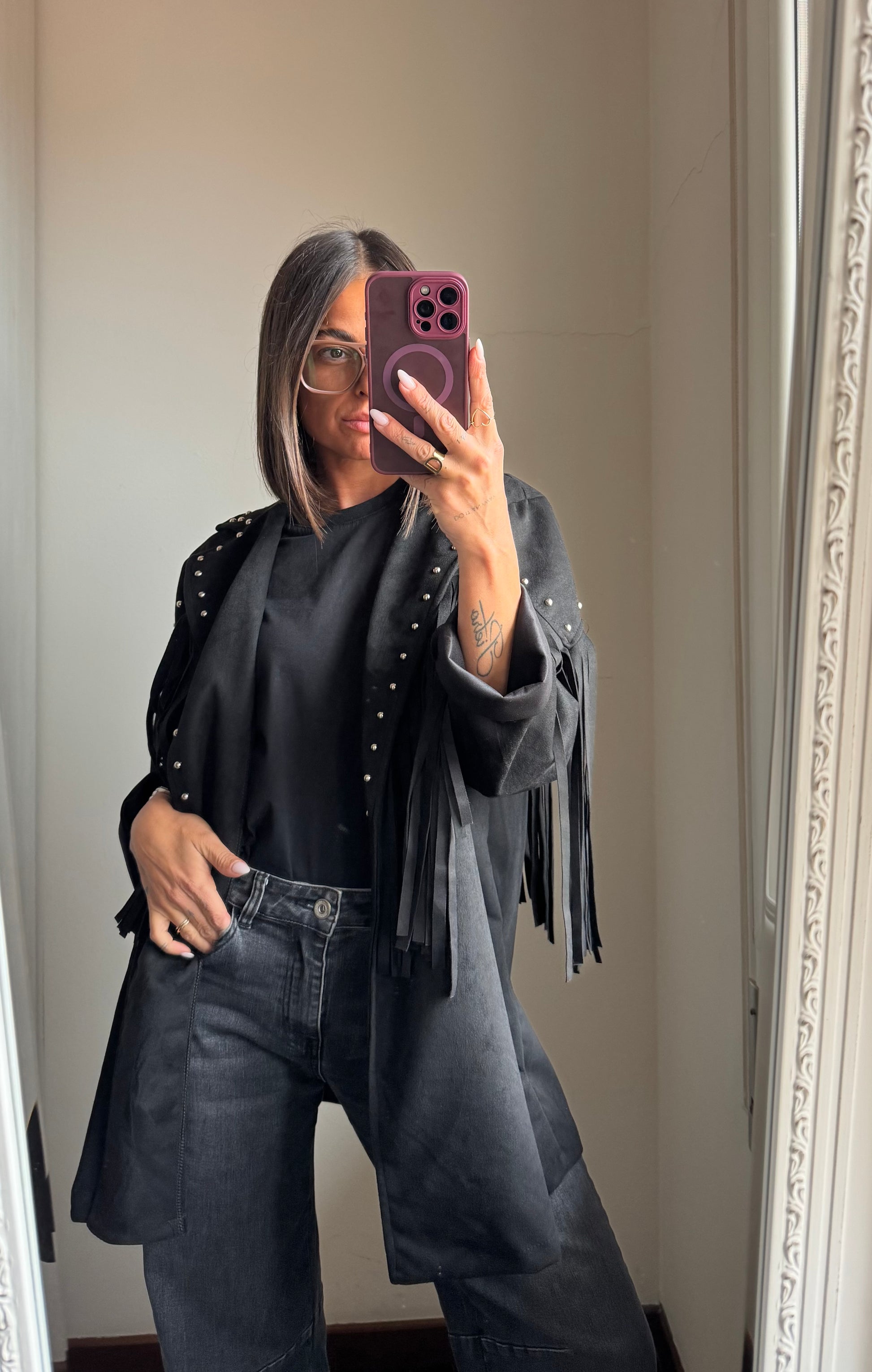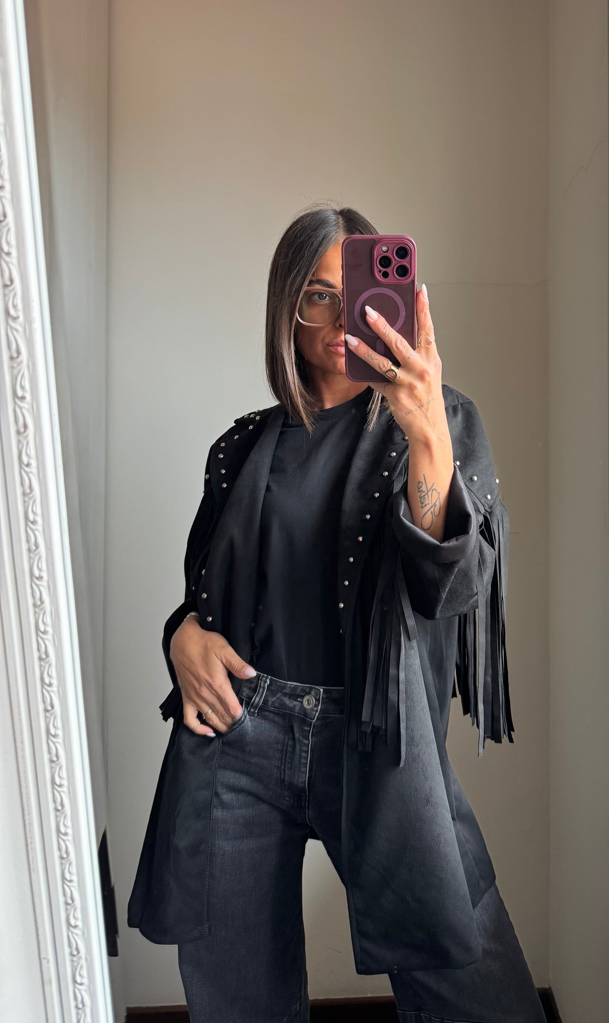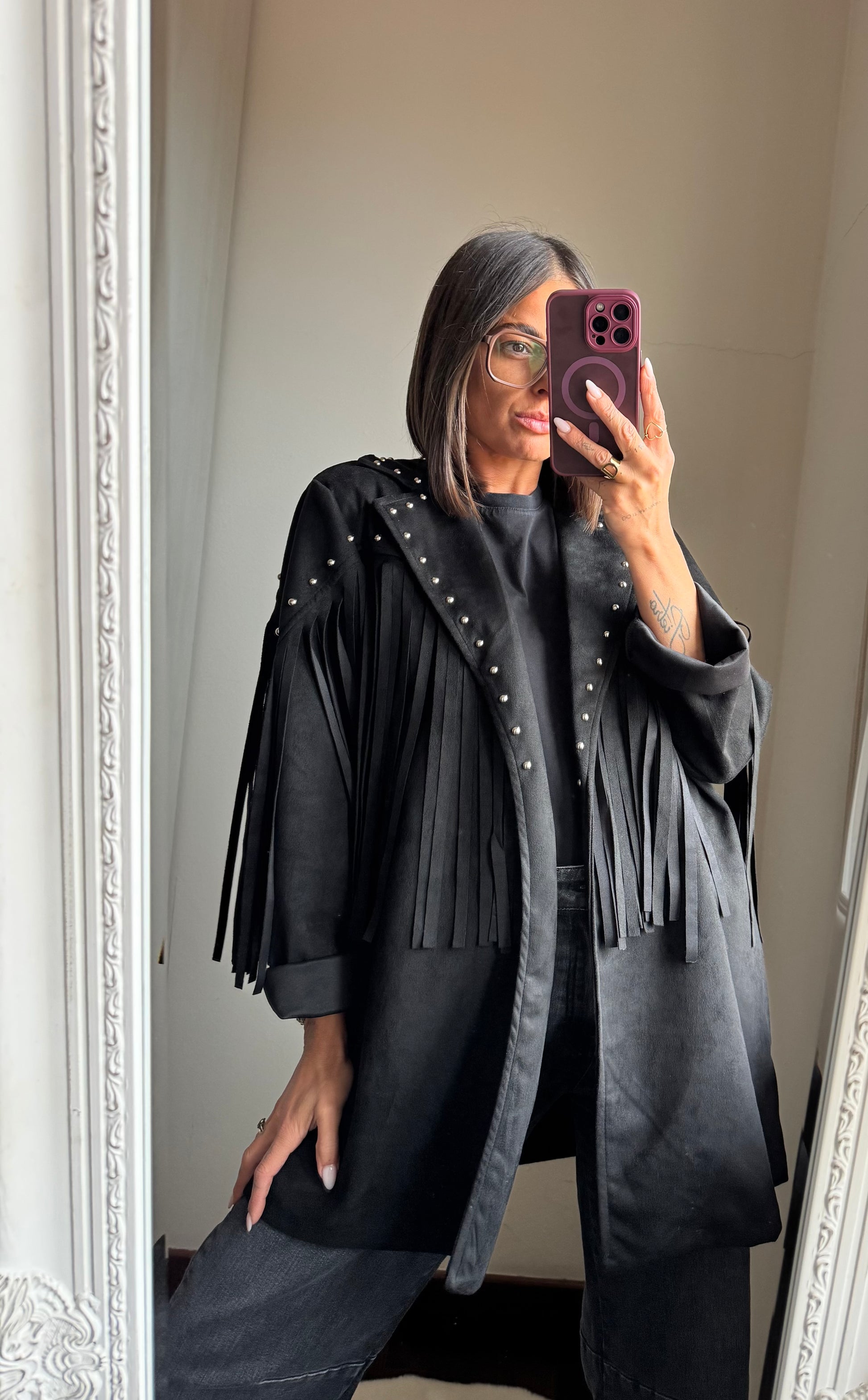 Giacca in tessuto scamosciato con l’applicazione di borchie, presenta frange sia davanti che dietro, non foderata