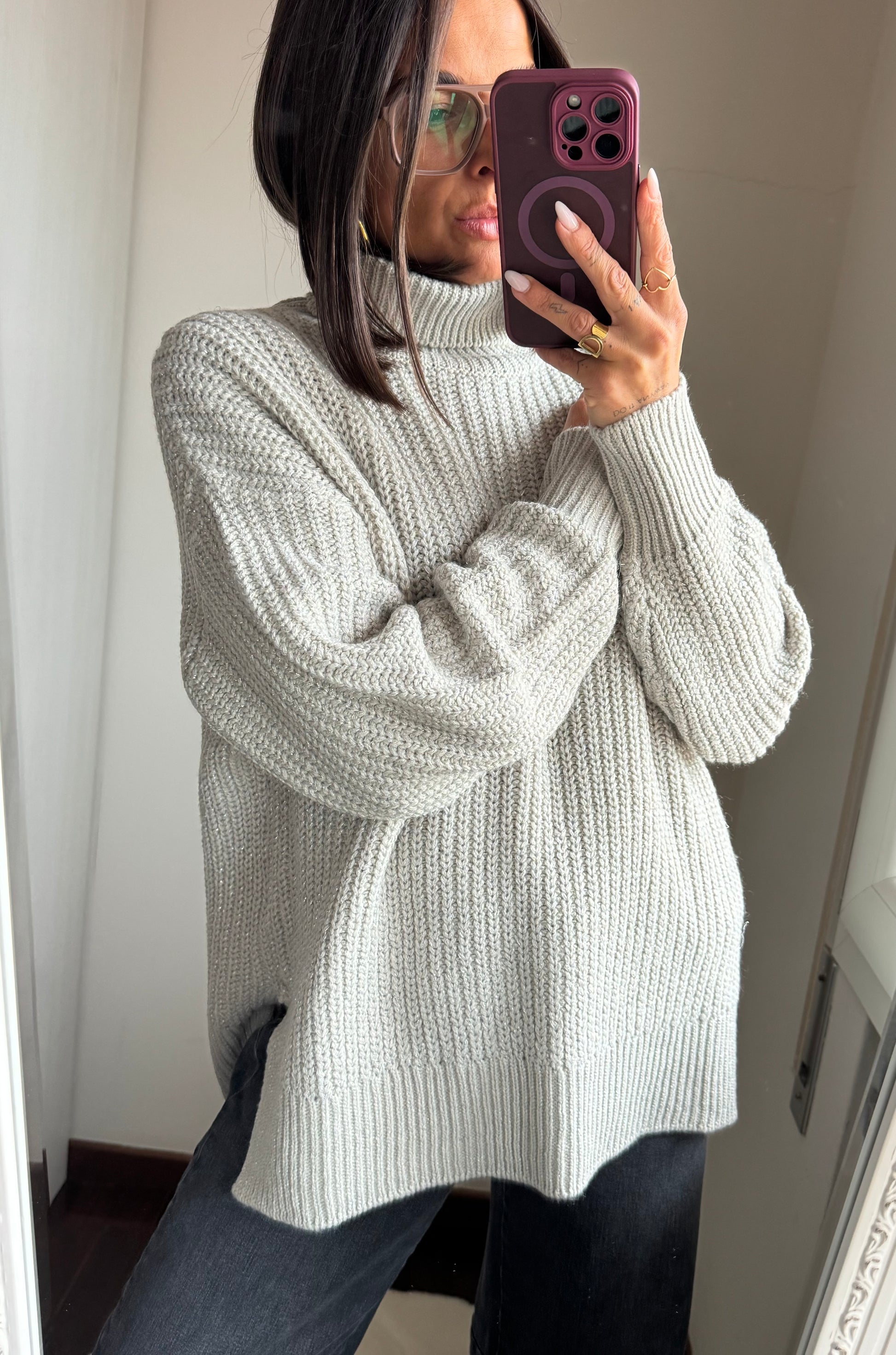Pullover con leggero filo lurex argento, presenta due piccoli spacchi laterali