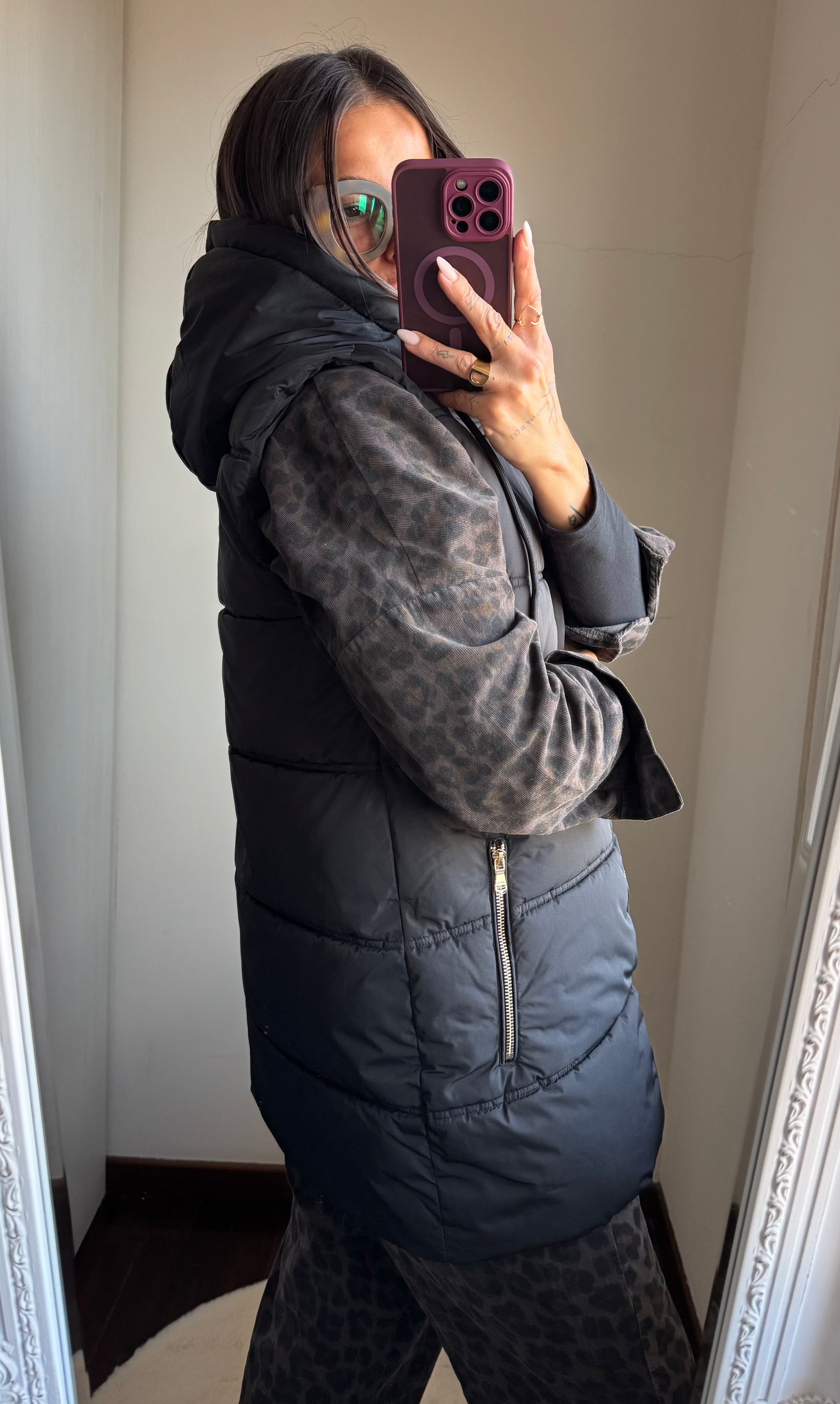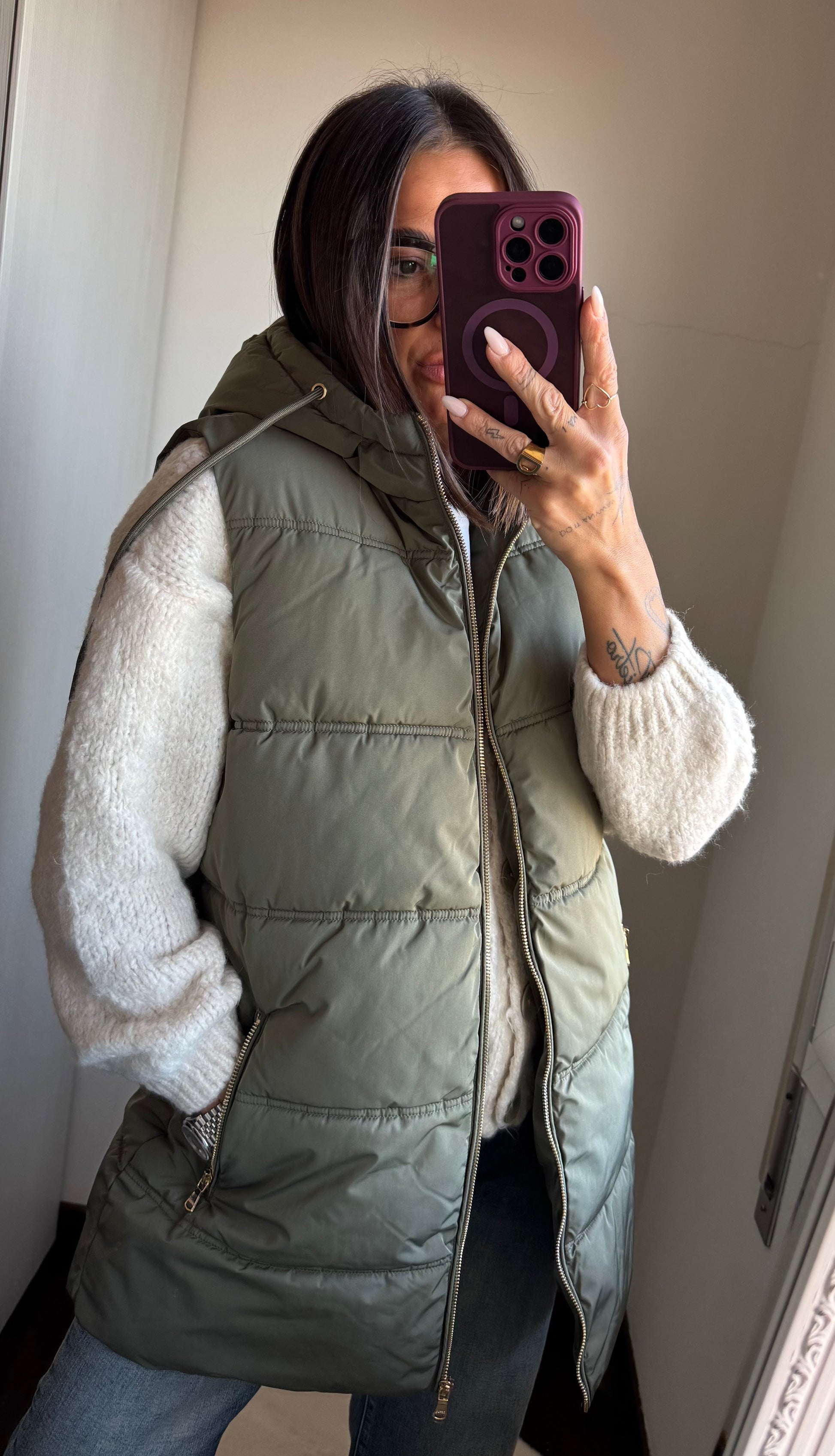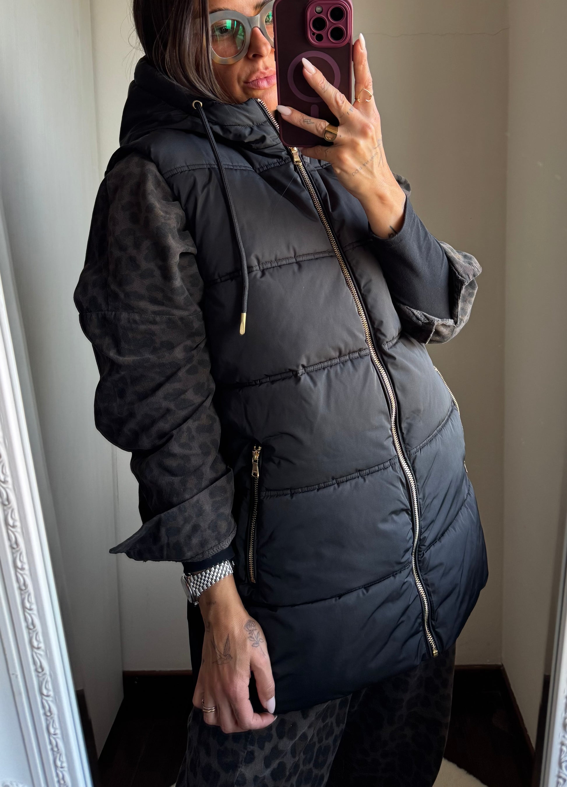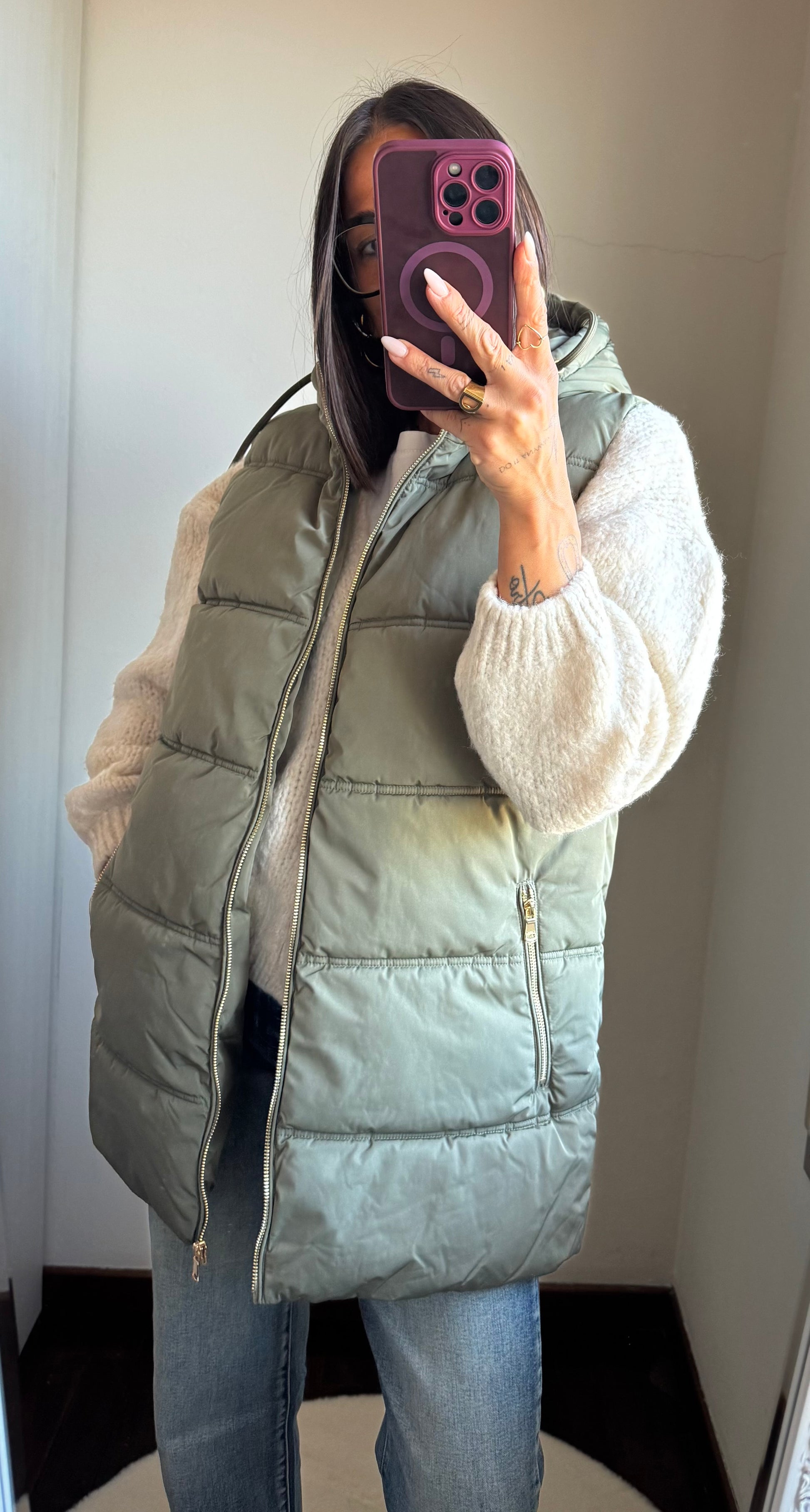 Smanicato imbottito con cappuccio, tasche con zip e chiusura con zip