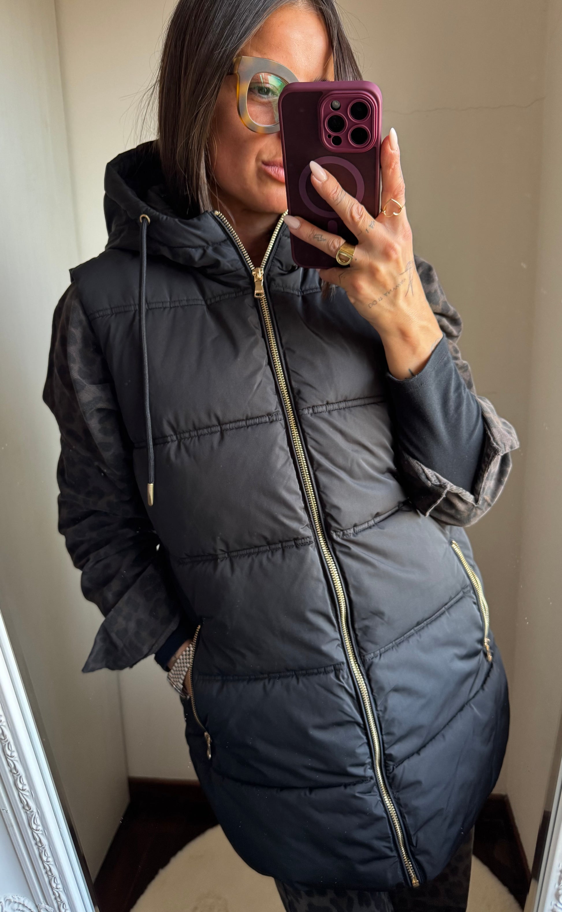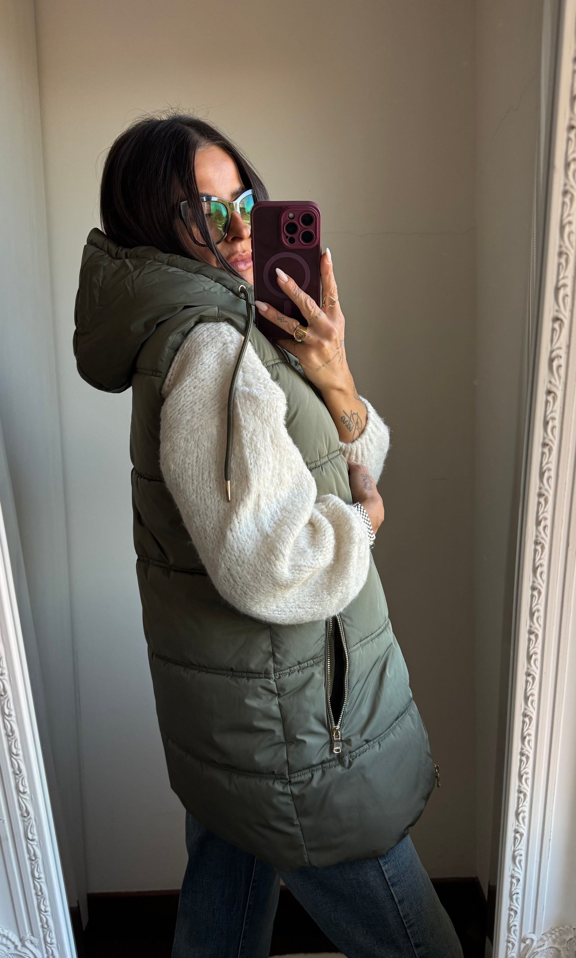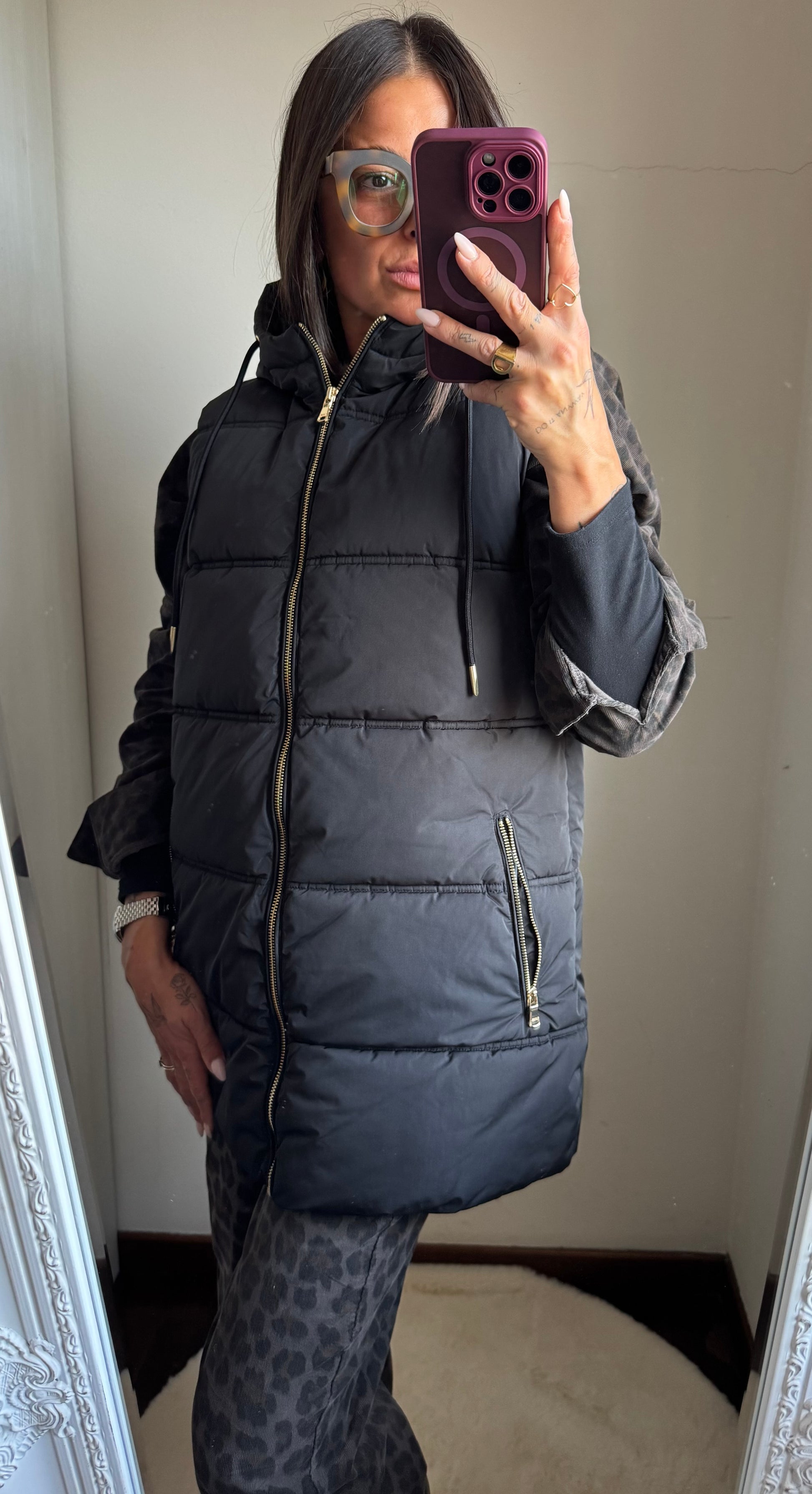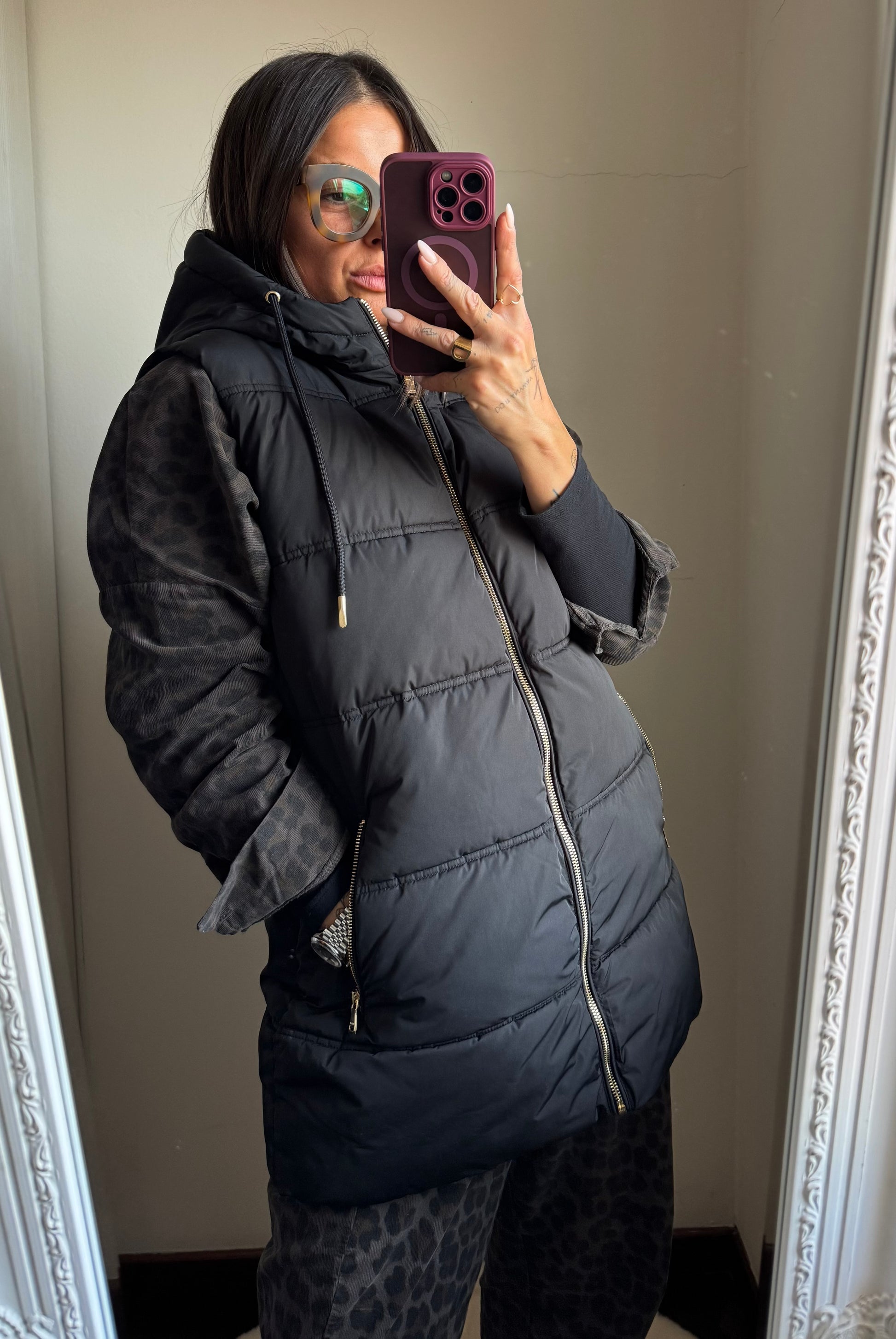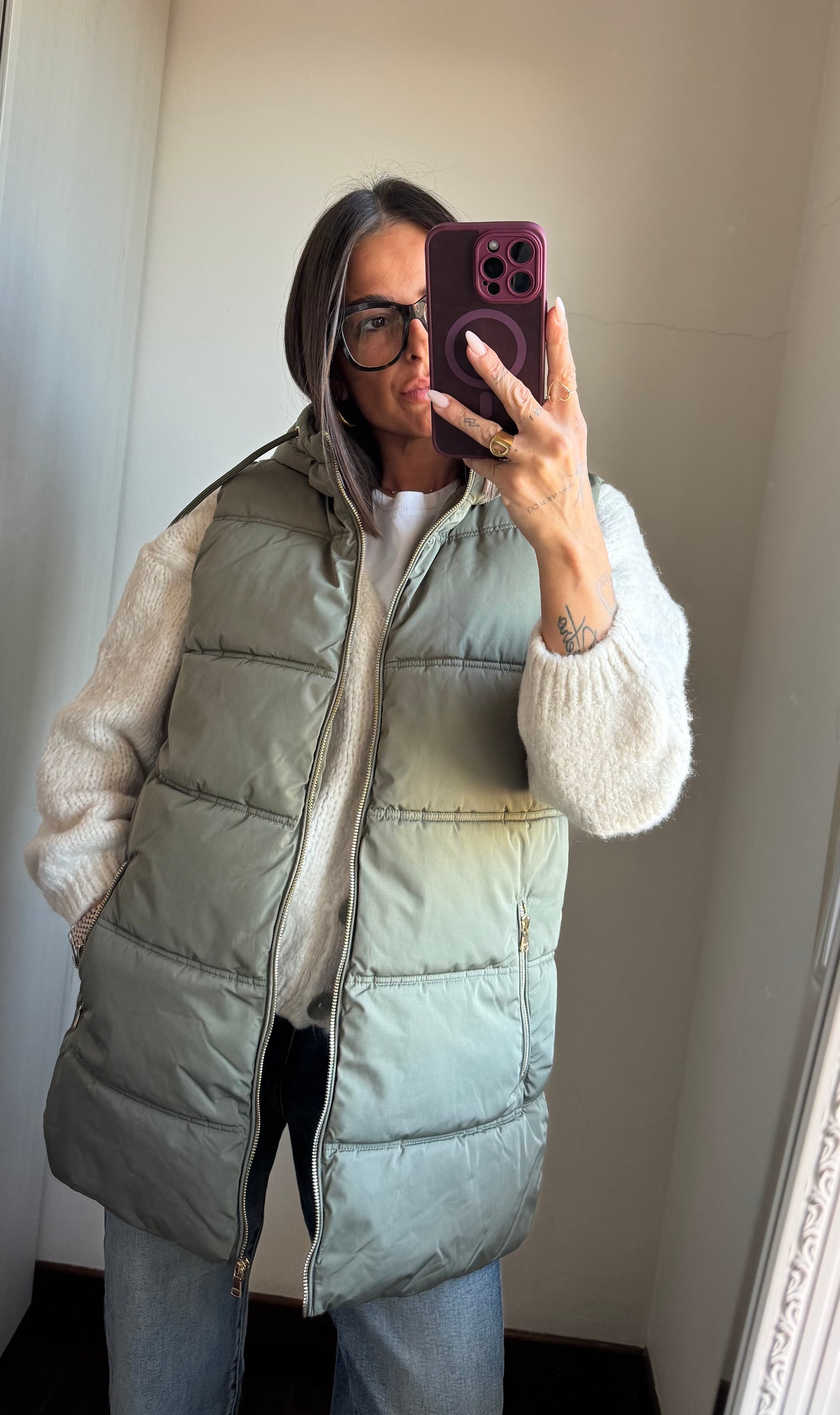 Smanicato imbottito con cappuccio, tasche con zip e chiusura con zip